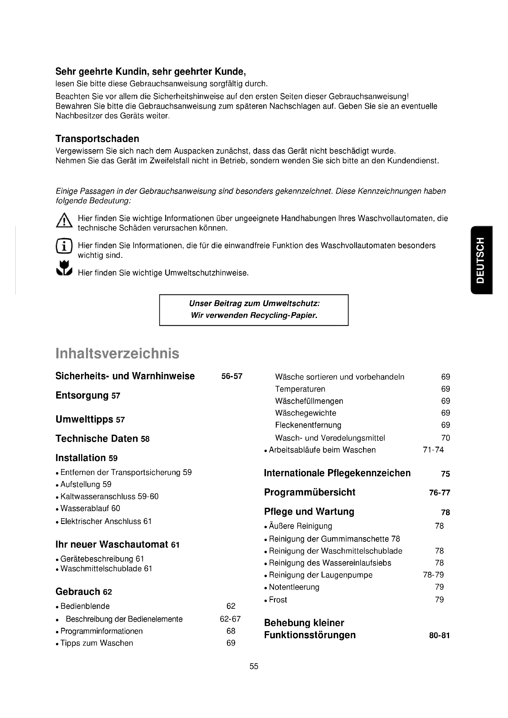 le filtre d’arrivée d’eau n’est pas obstrué (Pas d’eau: Voir robinet et tuyau). 132986251F.qxd 24/02/2005 16:15 Pagina 54 (Nero/Process Black pellicola)55 DEUTSCH Sehr geehrte Kundin, sehr geehrter Kunde, lesen Sie bitte diese Gebrauchsanweisung sorgfältig durch. Beachten Sie vor allem die Sicherheitshinweise auf den ersten Seiten dieser Gebrauchsanweisung! Bewahren Sie bitte die Gebrauchsanweisung zum späteren Nachschlagen auf. Geben Sie sie an eventuelle Nachbesitzer des Geräts weiter. Transportschaden Vergewissern Sie sich nach dem Auspacken zunächst, dass das Gerät nicht beschädigt wurde. Nehmen Sie das Gerät im Zweifelsfall nicht in Betrieb, sondern wenden Sie sich bitte an den Kundendienst. Einige Passagen in der Gebrauchsanweisung sind besonders gekennzeichnet. Diese Kennzeichnungen haben folgende Bedeutung: Hier finden Sie wichtige Informationen über ungeeignete Handhabungen lhres Waschvollautomaten, die technische Schäden verursachen können. Hier finden Sie Informationen, die für die einwandfreie Funktion des Waschvollautomaten besonders wichtig sind. Hier finden Sie wichtige Umweltschutzhinweise. Unser Beitrag zum Umweltschutz: Wir verwenden Recycling-Papier. Inhaltsverzeichnis Sicherheits- und Warnhinweise 56-57 Entsorgung 57 Umwelttipps 57 Technische Daten 58 Installation 59 ● Entfernen der Transportsicherung 59 ● Aufstellung 59 ● Kaltwasseranschluss 59-60 ● Wasserablauf 60 ● Elektrischer Anschluss 61 Ihr neuer Waschautomat 61 ● Gerätebeschreibung 61 ● Waschmittelschublade 61 Gebrauch 62 ● Bedienblende 62 ● Beschreibung der Bedienelemente 62-67 ● Programminformationen 68 ● Tipps zum Waschen 69 Wäsche sortieren und vorbehandeln 69 Temperaturen 69 Wäschefüllmengen 69 Wäschegewichte 69 Fleckenentfernung 69 Wasch- und Veredelungsmittel 70 ● Arbeitsabläufe beim Waschen 71-74 Internationale Pflegekennzeichen