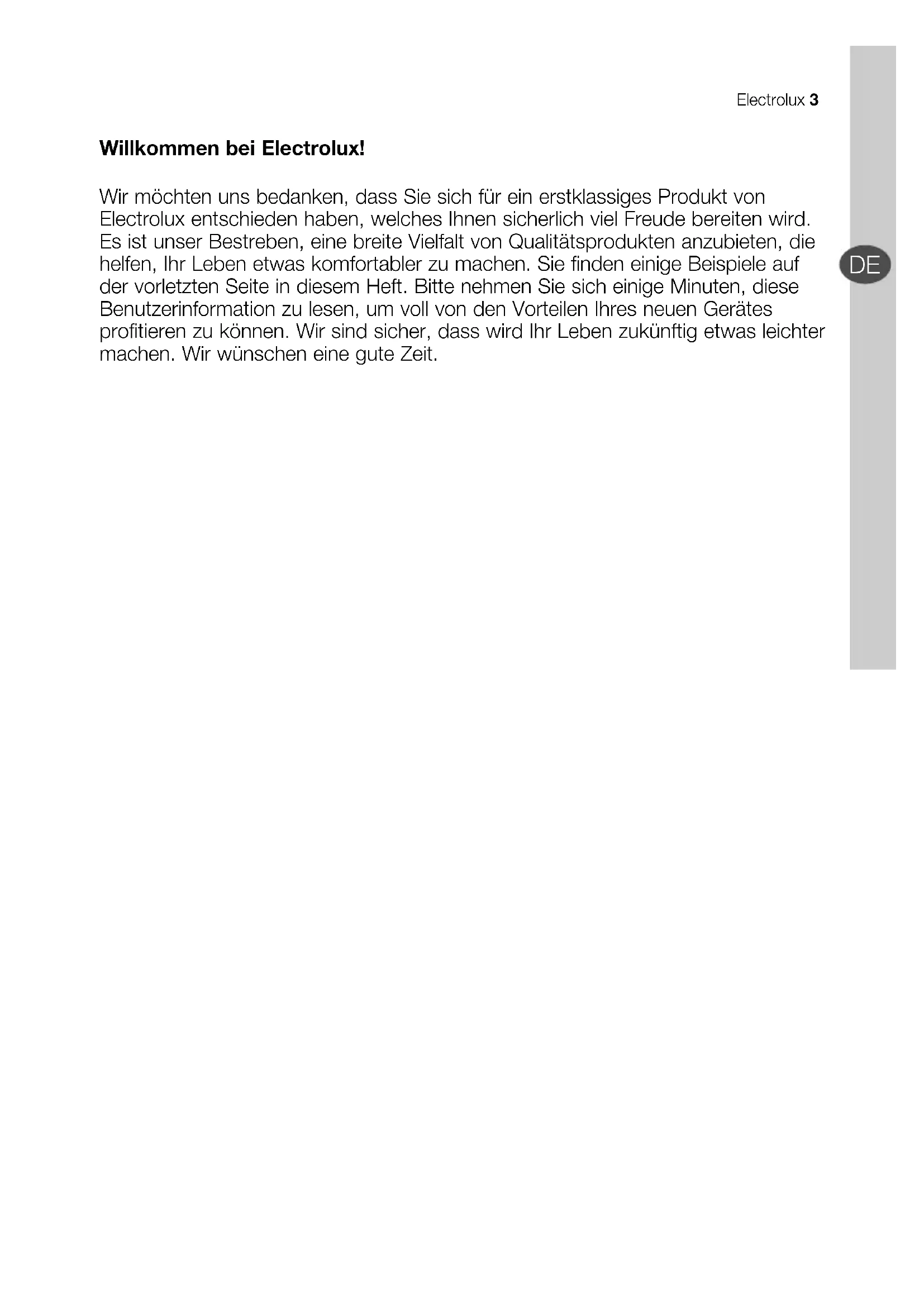 Wir möchten uns bedanken, dass Sie sich für ein erstklassiges Produkt von Electrolux entschieden haben, welches Ihnen sicherlich viel Freude bereiten wird. Es ist unser Bestreben, eine breite Vielfalt von Qualitätssprodukten anzubieten, die herself, Ihr Leben etwas komfortabler zu machen. Sie finden eine Beispiele auf der vorletzten Seite in dieser Heft.ittenehmenSie sich eine Minute,these Benutzerinformation zulesen,um voll von den Vorteilen Ihres neuen Gerates profitieren zu konnen. Wir sind safer, dass wird Ihr Leben zukünftig etwas leichter machen. Wir wünschen eine gute Zeit.