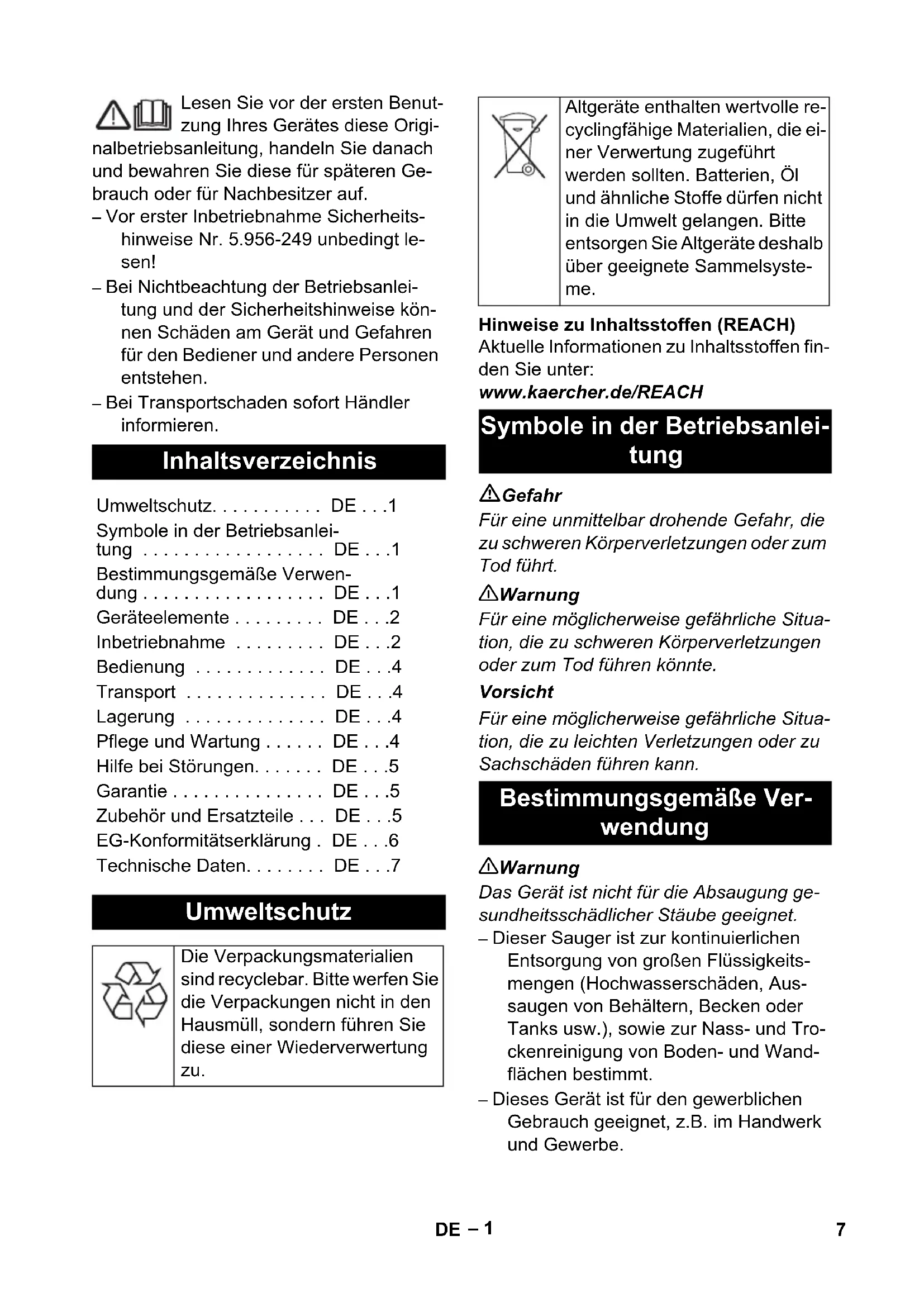 - 6– 1 Lesen Sie vor der ersten Benut- zung Ihres Gerätes diese Origi- nalbetriebsanleitung, handeln Sie danach und bewahren Sie diese für späteren Ge- brauch oder für Nachbesitzer auf. – Vor erster Inbetriebnahme Sicherheits- hinweise Nr. 5.956-249 unbedingt le- sen! – Bei Nichtbeachtung der Betriebsanlei- tung und der Sicherheitshinweise kön- nen Schäden am Gerät und Gefahren für den Bediener und andere Personen entstehen. – Bei Transportschaden sofort Händler informieren. Hinweise zu Inhaltsstoffen (REACH) Aktuelle Informationen zu Inhaltsstoffen fin- den Sie unter: www.kaercher.de/REACH Gefahr Für eine unmittelbar drohende Gefahr, die zu schweren Körperverletzungen oder zum Tod führt. 몇 Warnung Für eine möglicherweise gefährliche Situa- tion, die zu schweren Körperverletzungen oder zum Tod führen könnte. Vorsicht Für eine möglicherweise gefährliche Situa- tion, die zu leichten Verletzungen oder zu Sachschäden führen kann. 몇 Warnung Das Gerät ist nicht für die Absaugung ge- sundheitsschädlicher Stäube geeignet. – Dieser Sauger ist zur kontinuierlichen Entsorgung von großen Flüssigkeits- mengen (Hochwasserschäden, Aus- saugen von Behältern, Becken oder Tanks usw.), sowie zur Nass- und Tro- ckenreinigung von Boden- und Wand- flächen bestimmt. – Dieses Gerät ist für den gewerblichen Gebrauch geeignet, z.B. im Handwerk und Gewerbe. Inhaltsverzeichnis Umweltschutz
