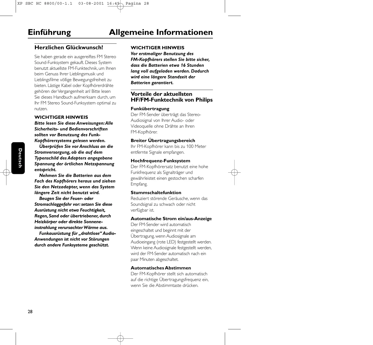 03-08-2001 16:45 Einführung Pagina 28 Allgemeine Informationen Herzlichen Glückwunsch! Sie haben gerade ein ausgereiftes FM Stereo Sound-Funksystem gekauft. Dieses System benutzt aktuellste FM-Funktechnik, um Ihnen beim Genuss Ihrer Lieblingsmusik und Lieblingsfilme völlige Bewegungsfreiheit zu bieten. Lästige Kabel oder Kopfhörerdrähte gehören der Vergangenheit an! Bitte lesen Sie dieses Handbuch aufmerksam durch, um Ihr FM Stereo Sound-Funksystem optimal zu nutzen. Deutsch WICHTIGER HINWEIS Bitte lesen Sie diese Anweisungen:Alle Sicherheits- und Bedienvorschriften sollten vor Benutzung des FunkKopfhörersystems gelesen werden. Überprüfen Sie vor Anschluss an die Stromversorgung, ob die auf dem Typenschild des Adapters angegebene Spannung der örtlichen Netzspannung entspricht. Nehmen Sie die Batterien aus dem Fach des Kopfhörers heraus und ziehen Sie den Netzadapter, wenn das System längere Zeit nicht benutzt wird. Beugen Sie der Feuer- oder Stromschlaggefahr vor: setzen Sie diese Ausrüstung nicht etwa Feuchtigkeit, Regen, Sand oder übertriebener, durch Heizkörper oder direkte Sonneneinstrahlung verursachter Wärme aus. Funkausrüstung für „drahtlose“ AudioAnwendungen ist nicht vor Störungen durch andere Funksysteme geschützt. WICHTIGER HINWEIS Vor erstmaliger Benutzung des FM-Kopfhörers stellen Sie bitte sicher, dass die Batterien etwa 16 Stunden lang voll aufgeladen werden. Dadurch wird eine längere Standzeit der Batterien garantiert. Vorteile der aktuellsten HF/FM-Funktechnik von Philips Funkübertragung Der FM-Sender überträgt das StereoAudiosignal von Ihrer Audio- oder Videoquelle ohne Drähte an Ihren FM-Kopfhörer. Breiter Übertragungsbereich Ihr FM-Kopfhörer kann bis zu 100 Meter entfernte Signale empfangen. Hochfrequenz-Funksystem Der FM-Kopfhörersatz benutzt eine hohe Funkfrequenz als Signalträger und gewährleistet einen gestochen scharfen Empfang. Stummschaltefunktion Reduziert störende Geräusche, wenn das Soundsignal zu schwach oder nicht verfügbar ist. Automatische Strom ein/aus-Anzeige Der FM-Sender wird automatisch eingeschaltet und beginnt mit der Übertragung, wenn Audiosignale am Audioeingang (rote LED) festgestellt werden. Wenn keine Audiosignale festgestellt werden, wird der FM-Sender automatisch nach ein paar Minuten abgeschaltet. Automatisches Abstimmen Der FM-Kopfhörer stellt sich automatisch auf die richtige Übertragungsfrequenz ein, wenn Sie die Abstimmtaste drücken.