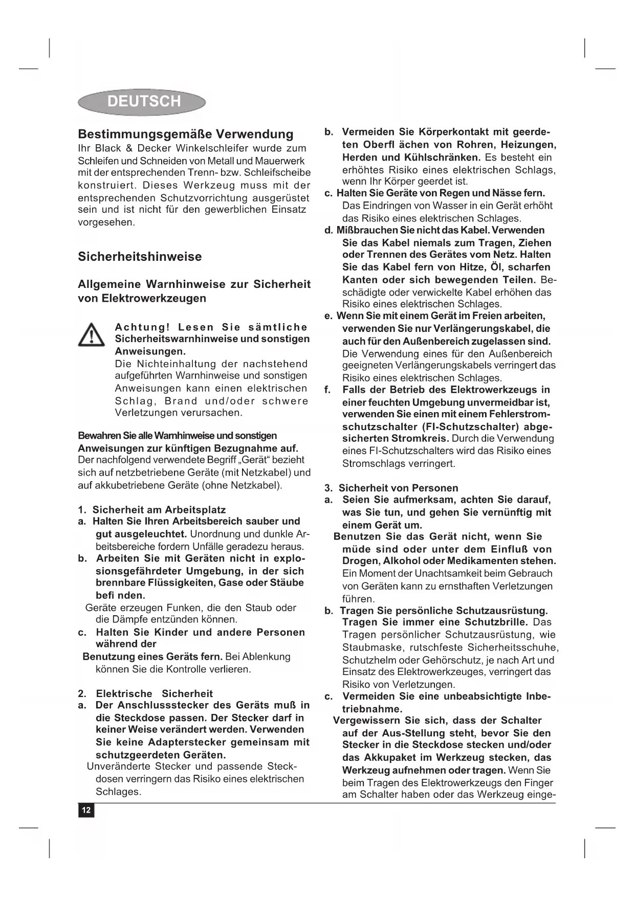 DEUTSCH EG-Konformitätserklärung MASCHINENRICHTLINIE KG2000/KG2001 Black & Decker erklärt, dass die unter "Technische Daten" beschriebenen Geräte übereinstimmen mit: 2006/42/EG, EN 60745-1, EN 60745-2-3 Diese Produkte entsprechen außerdem den Richtlinien 2004/108/EG und 2011/65/EU. Für weitere Informationen wenden Sie sich bitte an Black & Decker Europe unter der folgenden Adresse oder schauen Sie auf der Rückseite dieser Betriebsanleitung nach. Weitere Informationen erhalten Sie von Black & Decker unter Rückseite dieser Anleitung. Der Unterzeichnete ist verantwortlich für die Zusammenstel- lung der technischen Daten und gibt diese Erklärung im Namen von Black & Decker ab. Kevin Hewitt Vice-President Global Engineering Black & Decker Europe, 210 Bath Road, Slough, Berkshire, SL1 3YD Vereinigtes Königreich 20/08/2012 Garantie Black & Decker vertraut auf die Qualität der eigenen Geräte und bietet dem Käufer eine außergewöhnliche Garantie. Diese Garantiezusage versteht sich unbeschadet der gesetzlichen Gewährleistungsansprüche und schränkt diese keinesfalls ein. Sie gilt in sämtlichen Mitgliedsstaaten der Europäischen Union und der Europäischen Freihandelszone EFTA. Tritt innerhalb von 24 Monaten ab Kaufdatum an einem Gerät von Black & Decker ein auf Material- oder Verarbeitungsfehler zurückzuführender Mangel auf, garantiert Black & Decker den Austausch defekter Teile, die Reparatur von Geräten mit üblichem Verschleiß bzw. den Austausch eines mangelhaften Geräts, ohne den Kunden dabei mehr als unbedingt nötig in Anspruch zu nehmen, allerdings vorbehaltlich folgender Ausnahmen: wenn das Gerät gewerblich, berufl ich oder im Verleihgeschäft benutzt wurde; wenn das Gerät mißbräuchlich verwendet oder mit mangelnder Sorgfalt behandelt wurde; wenn das Gerät durch irgendwelche Fremdeinwirkung beschädigt wurde; wenn ein unbefugter Reparaturversuch durch anderes Personal als das einer Vertragswerkstatt oder des Black & Decker-Kundendienstes unternommen wurde. Zur Inanspruchnahme dieser Garantie ist dem Verkäufer bzw. der Vertragswerkstatt ein Kaufnachweis vorzulegen. Der Kaufnachweis muß Kaufdatum und Gerätetyp bescheinigen. Die Adresse des zuständigen Büros von Black & Decker steht in dieser Anleitung, darüber läßt sich die nächstgelegene Vertragswerkstatt ermitteln. Außerdem ist eine Liste der Vertragswerkstätten und aller Kundendienststellen von Black & Decker sowie der zuständigen Ansprechpartner im Internet zu fi nden unter: www.2helpU.com Bitte besuchen Sie untere Webseite www.blackanddecker.de, um Ihr neues Black & Decker Produkt zu registrieren und über neue Produkte und Sonderangebote aktuell informiert zu werden. Weitere Informationen über die Marke Black & Decker und unsere Produkte fi nden Sie unter www.blackanddecker.de21 FRANÇAIS Utilisation prévue Votre meuleuse d’angle Black & Decker a été conçue pour meuler et découper le métal et le béton avec des disques de tronçonnage ou de meulage spécifi ques. Équipé du carter de protection approprié, cet outil est réservé à un usage domestique. Instructions de sécurité Consignes de sécurité générales pour les outils électriques Attention! Prenez connaissance de tous les avertissements de sécurité et de toutes les instructions. Le non-respect des avertissements et des instructions indiqués ci-dessous peut entraîner une électrocution, un incendie ou de graves blessures. Conservez tous les avertissements et instructions pour référence future. La notion d’« outil électroportatif » mentionnée par la suite se rapporte à des outils électriques raccordés au secteur (avec câble de raccordement) ou fonctionnant sur piles (sans fi l).