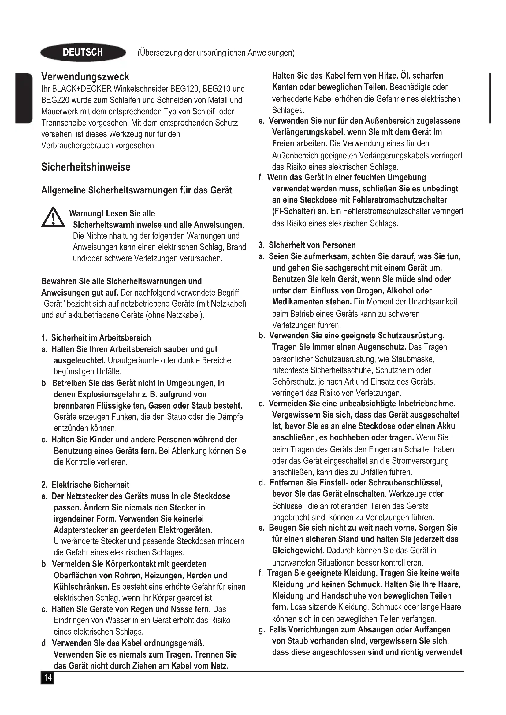 Garantie Black & Decker vertraut auf die Qualität der eigenen Geräte und bietet dem Käufer eine außergewöhnliche Garantie von 24 Monaten ab Kaufdatum. Diese Garantie versteht sich unbeschadet der gesetzlichen Gewährleistungsansprüche und schränkt diese keinesfalls ein. Diese Garantie gilt innerhalb der Staatsgebiete der Mitgliedstaaten der Europäischen Union und der Europäischen Freihandelszone. Zur Inanspruchnahme dieser Garantie muss sie den allgemeinen Geschäftsbedingungen von Black & Decker entsprechen und dem Verkäufer bzw. der Vertragswerkstatt ist ein Kaufnachweis vorzulegen. Die Bedingungen für die Utilisation prévue Vos meuleuses d’angle BLACK+DECKER BEG110, BEG120, BEG210 et BEG220 ont été conçues pour le meulage et le tronçonnage du métal et des matériaux de maçonnerie à l’aide de disques à tronçonner et à meuler adaptés. Équipés des dispositifs de protection appropriés, ces outils ne sont prévus que pour un usage grand public. Consignes de sécurité Avertissements de sécurité générale liés aux outils électriques