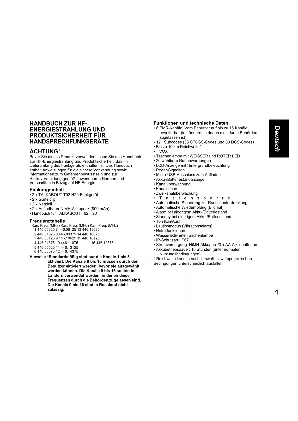 - Handbuch für TALKABOUT T92 H20 Frequenztabelle Hinweis: *Standardmäßig sind nur die Kanäle 1 bis 8 aktiviert. Die Kanäle 9 bis 16 müssen durch den Benutzer aktiviert werden, bevor sie ausgewählt werden können. Die Kanäle 9 bis 16 sollten in Ländern verwendet werden, in denen diese Frequenzen durch die Behörden zugelassen sind. Die Kanäle 9 bis 16 sind in Russland nicht zulässig. Funktionen und technische Daten