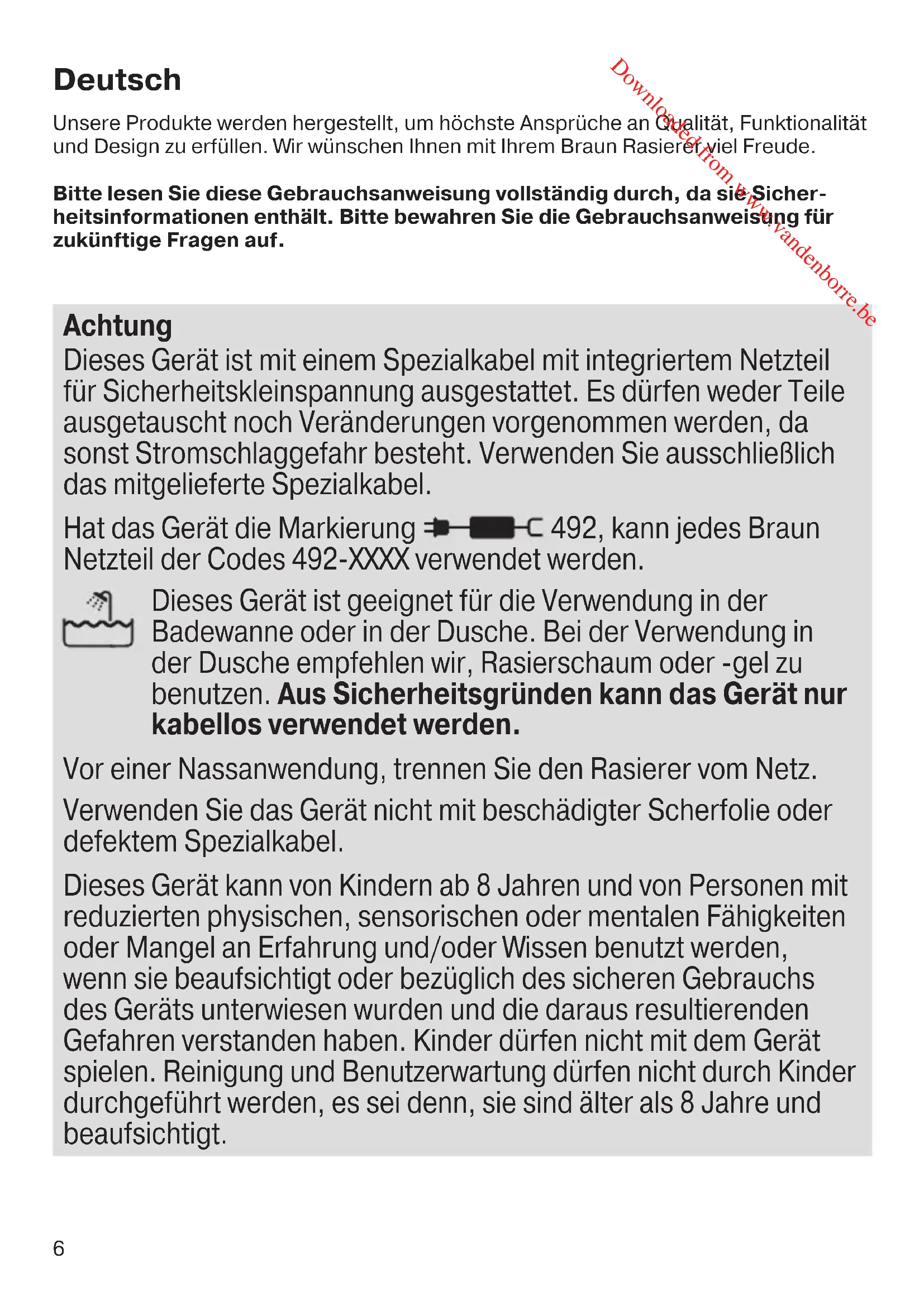 91092670_Series_5-2_SOLO_Euro_S5.indd 191092670_Series_5-2_SOLO_Euro_S5.indd 1 23.11.16 13:1623.11.16 13:16 CSS APPROVED Effective Date 8Dec2016 GMT - Printed 05Apr2017 Page 4 of 139 Downloaded from www.vandenborre.be6 Deutsch Unsere Produkte werden hergestellt, um höchste Ansprüche an Qualität, Funktionalität und Design zu erfüllen. Wir wünschen Ihnen mit Ihrem Braun Rasierer viel Freude. Bitte lesen Sie diese Gebrauchsanweisung vollständig durch, da sie Sicher- heitsinformationen enthält. Bitte bewahren Sie die Gebrauchsanweisung für zukünftige Fragen auf. Achtung Dieses Gerät ist mit einem Spezialkabel mit integriertem Netzteil für Sicherheitskleinspannung ausgestattet. Es dürfen weder Teile ausgetauscht noch Veränderungen vorgenommen werden, da sonst Stromschlaggefahr besteht. Verwenden Sie ausschließlich das mitgelieferte Spezialkabel. Hat das Gerät die Markierung 492, kann jedes Braun Netzteil der Codes 492-XXXX verwendet werden. Dieses Gerät ist geeignet für die Verwendung in der Badewanne oder in der Dusche. Bei der Verwendung in der Dusche empfehlen wir, Rasierschaum oder -gel zu benutzen. Aus Sicherheitsgründen kann das Gerät nur kabellos verwendet werden. Vor einer Nassanwendung, trennen Sie den Rasierer vom Netz. Verwenden Sie das Gerät nicht mit beschädigter Scherfolie oder defektem Spezialkabel. Dieses Gerät kann von Kindern ab 8 Jahren und von Personen mit reduzierten physischen, sensorischen oder mentalen Fähigkeiten oder Mangel an Erfahrung und/oder Wissen benutzt werden, wenn sie beaufsichtigt oder bezüglich des sicheren Gebrauchs des Geräts unterwiesen wurden und die daraus resultierenden Gefahren verstanden haben. Kinder dürfen nicht mit dem Gerät spielen. Reinigung und Benutzerwartung dürfen nicht durch Kinder durchgeführt werden, es sei denn, sie sind älter als 8 Jahre und beaufsichtigt. 91092670_Series_5-2_SOLO_Euro_S6-140.indd 691092670_Series_5-2_SOLO_Euro_S6-140.indd 6 05.12.16 13:2205.12.16 13:22 CSS APPROVED Effective Date 8Dec2016 GMT - Printed 05Apr2017 Page 5 of 139 Downloaded from www.vandenborre.be7 Rasierer 1 Schersystem 2 Entriegelungstaste für den Scherkopf 3 MultiHeadLock Schalter 4 Ein-/Ausschalter 5 Rasierer-Display 5a Einschaltsperre (Schlosssymbol) 5b Ladebalken 5c Batterieanzeige 6 Langhaarschneider 7 Kontakte Rasierer – Ladestation 8 Entriegelungstaste für den Langhaarschneider 9 Rasierer-Buchse 10 Spezialkabel (Aussehen kann abweichen) 11 Ladestation* 12 Schutzkappe* 13 Reiseetui* *nicht bei allen Modellen Vor der ersten Rasur / Aufladen Mit dem Spezialkabel (10) den ausgeschalteten Rasierer über die Buchse (9) am Netz oder in der Ladestation (11) aufladen. Gebrauchsinformation
