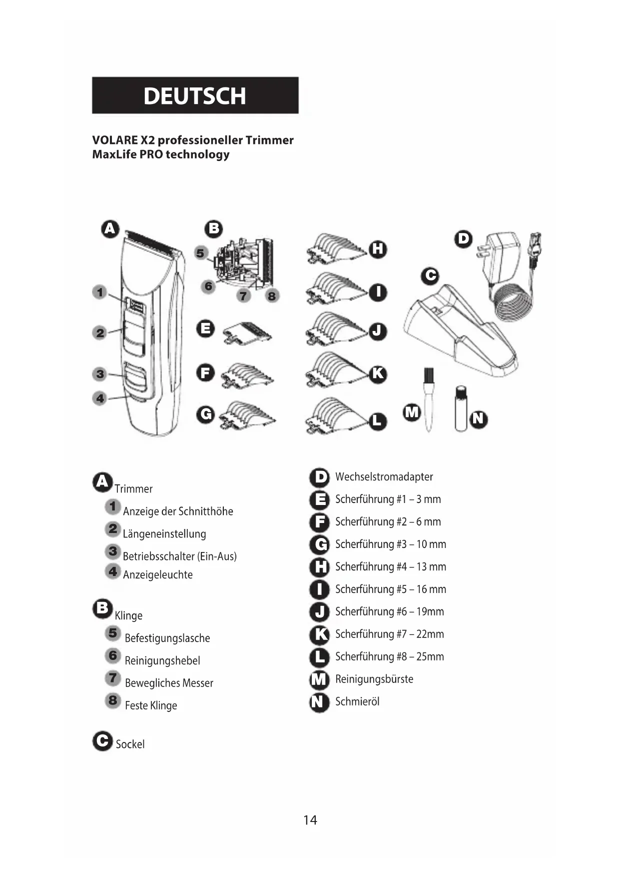 DEUTSCH15 Wechselstromadapter Scherführung #1 – 3 mm Scherführung #2 – 6 mm Scherführung #3 – 10 mm Scherführung #4 – 13 mm Scherführung #5 – 16 mm Scherführung #6 – 19mm Scherführung #7 – 22mm Scherführung #8 – 25mm Reinigungsbürste Schmieröl