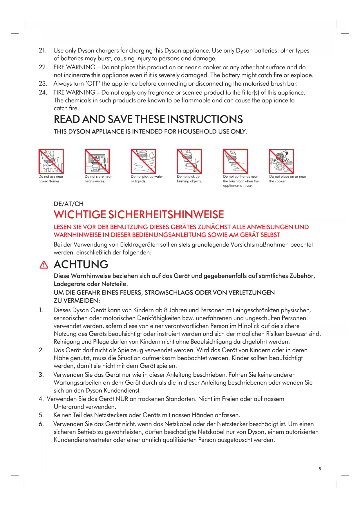 THIS DYSON APPLIANCE IS INTENDED FOR HOUSEHOLD USE ONLY. DE/AT/CH WICHTIGE SICHERHEITSHINWEISE LESEN SIE VOR DER BENUTZUNG DIESES GERÄTES ZUNÄCHST ALLE ANWEISUNGEN UND WARNHINWEISE IN DIESER BEDIENUNGSANLEITUNG SOWIE AM GERÄT SELBST Bei der Verwendung von Elektrogeräten sollten stets grundlegende Vorsichtsmaßnahmen beachtet werden, einschließlich der folgenden: ACHTUNG Diese Warnhinweise beziehen sich auf das Gerät und gegebenenfalls auf sämtliches Zubehör, Ladegeräte oder Netzteile. UM DIE GEFAHR EINES FEUERS, STROMSCHLAGS ODER VON VERLETZUNGEN ZU VERMEIDEN: