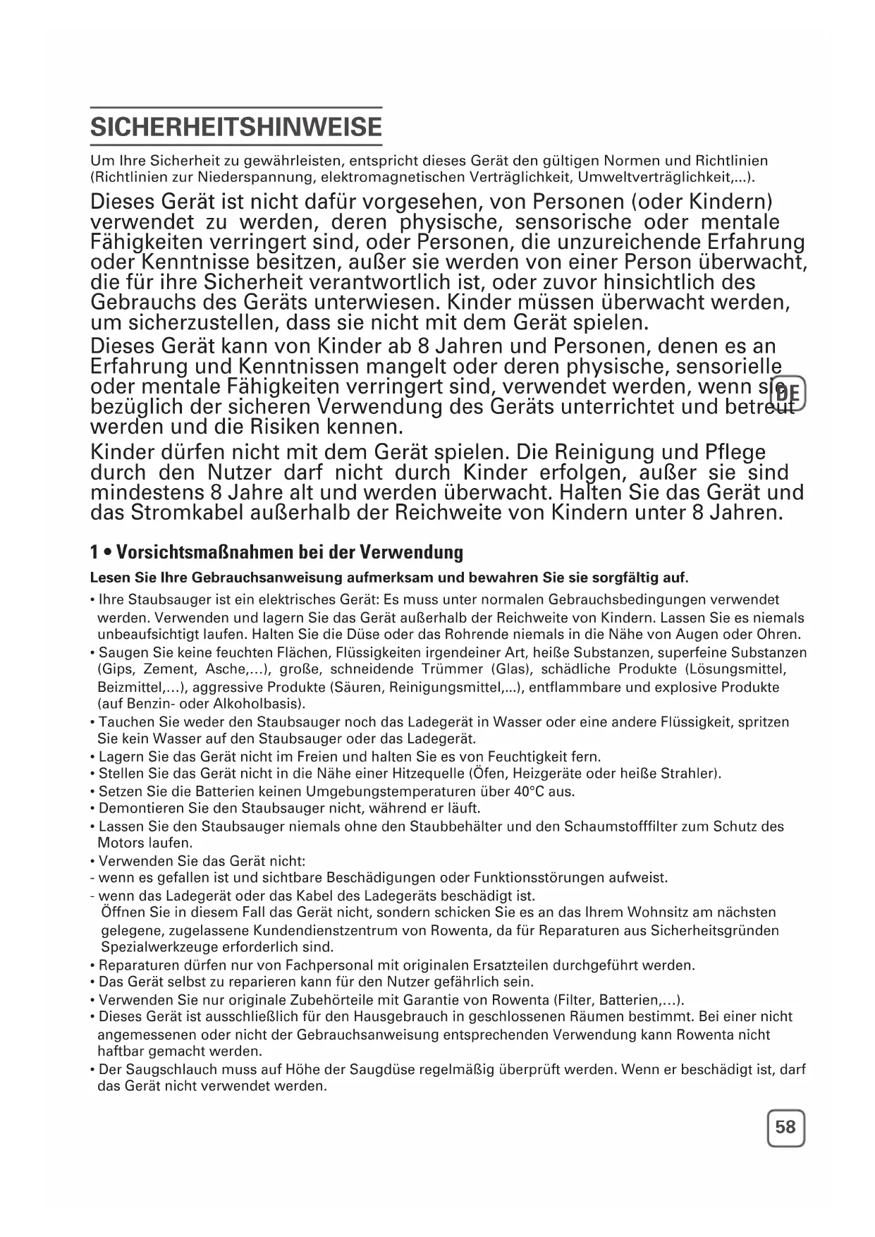 - Dieses Gerät ist ausschließlich für den Hausgebrauch in geschlossenen Räumen bestimmt. Bei einer nicht angemessenen oder nicht der Gebrauchsanweisung entsprechenden Verwendung kann Rowenta nicht haftbar gemacht werden.