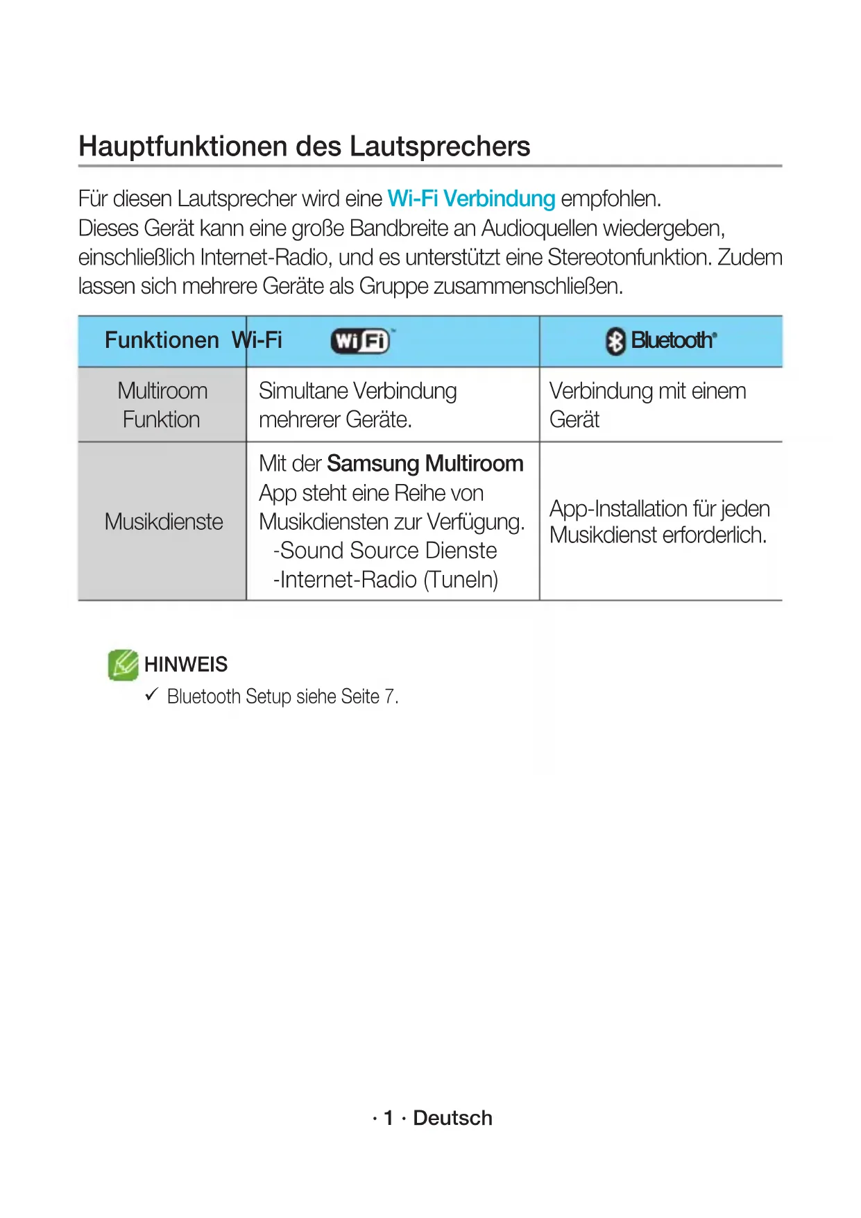 Pokud nelze připojení navázat, zkontrolujte „Kontrolní seznam před připojením“ na stránkách 9 a 10. WAM1501-EN_15p-CZ-QSG_0901.indd 15 2016-09-01 4:57:24· 1 · Deutsch Hauptfunktionen des Lautsprechers Für diesen Lautsprecher wird eine Wi-Fi Verbindung empfohlen. Dieses Gerät kann eine große Bandbreite an Audioquellen wiedergeben, einschließlich Internet-Radio, und es unterstützt eine Stereotonfunktion. Zudem lassen sich mehrere Geräte als Gruppe zusammenschließen. Funktionen Wi-Fi Bluetooth Multiroom Funktion Simultane Verbindung mehrerer Geräte. Verbindung mit einem Gerät Musikdienste Mit der Samsung Multiroom App steht eine Reihe von Musikdiensten zur Verfügung. - Sound Source Dienste - Internet-Radio (Tuneln) App-Installation für jeden Musikdienst erforderlich. HINWEIS