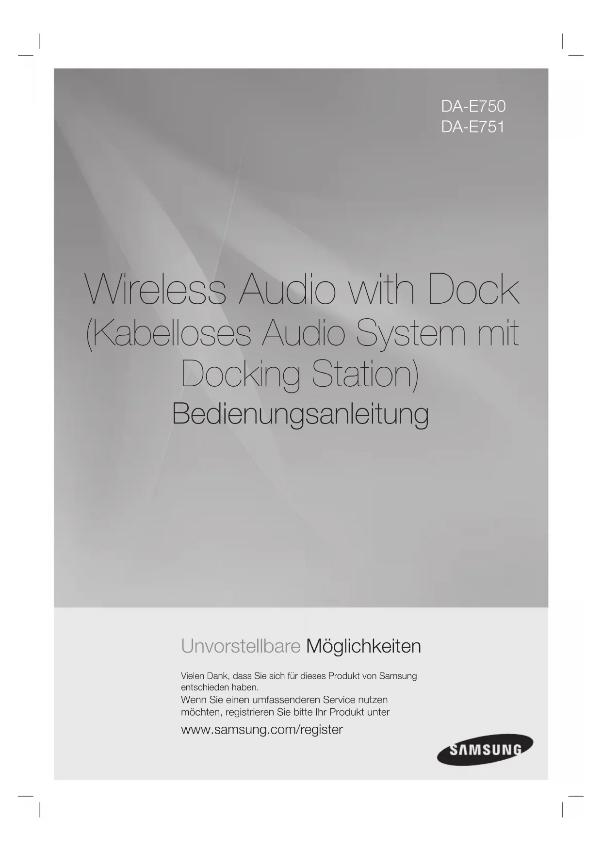 678) www.samsung.com SWEDEN 0771 726 7864 (SAMSUNG) www.samsung.com Switzerland 0848 - SAMSUNG(7267864, CHF 0.08/min) www.samsung.com/ch www.samsung.com/ch_ fr (French) U.K 0330 SAMSUNG (7267864) www.samsung.com EIRE 0818 717100 www.samsung.com LITHUANIA 8-800-77777 www.samsung.com LATVIA 8000-7267 www.samsung.com ESTONIA 800-7267 www.samsung.com Contacter SAMSUNG WORLD WIDE Pour toutes questions ou observations concernant les produits Samsung, veuillez contacter le service clientèle de SAMSUNG.Wireless Audio with Dock (Kabelloses Audio System mit Docking Station) Bedienungsanleitung Unvorstellbare Möglichkeiten Vielen Dank, dass Sie sich für dieses Produkt von Samsung entschieden haben.Wenn Sie einen umfassenderen Service nutzen möchten, registrieren Sie bitte Ihr Produkt unterwww.samsung.com/register DA-E750 DA-E7512 funktionen AllShare Play Dient zur Wiedergabe von auf Geräten (wie PC, Smartphone, oder NAS) gespeicherten Musiktiteln über das Kabellose Audio System mit Docking Station mittels einer Netzwerkverbindung AirPlay Dient zur Wiedergabe von auf Ihren Apple Geräten gespeicherten Musiktiteln über das Kabellose Audio System mit Docking Station. Dual Docking Audio Lautsprechersystem Mit Hilfe der Dual Docking Station des Systems können Sie Ihr Samsung Galaxy oder Apple Gerät anschließen, aufladen und über die integrierten Lautsprecher abspielen. Musikwiedergabe über USB-Anschluss An den USB-Anschluss des Kabellosen Audio Systems mit Docking Station können externe USB-Speichergeräte, wie MP3-Player oder USB-Flash-Speicher angeschlossen und die darauf enthaltenen Dateien wiedergegeben werden. Bluetooth Funktion Nach dem Anschließen eines Bluetooth Geräts an das Kabellose Audio System mit Docking Station können Sie Musik von diesem Gerät in bester Stereo Klangqualität ganz ohne Kabel wiedergeben. aptX