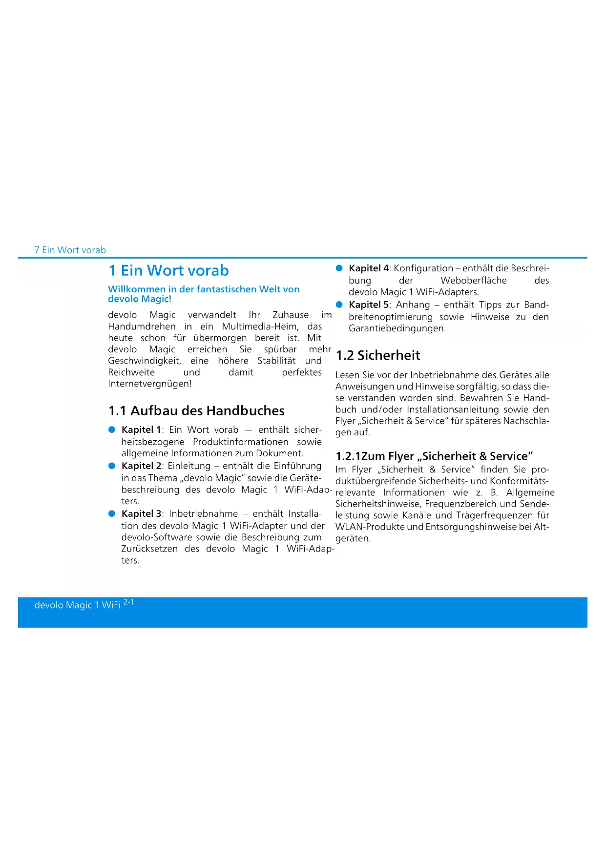 Im Flyer „Sicherheit & Service“ finden Sie pro- duktübergreifende Sicherheits- und Konformitäts- relevante Informationen wie z. B. Allgemeine Sicherheitshinweise, Frequenzbereich und Sende- leistung sowie Kanäle und Trägerfrequenzen für WLAN-Produkte und Entsorgungshinweise bei Alt- geräten. Magic_1_WiFi_2-1.book Seite 7 Samstag, 27. August 2022 5:18 17Ein Wort vorab 8 devolo Magic 1 WiFi 2-1 Flyer und Installationsanleitung liegen je- dem Produkt in gedruckter Form bei; dieses Produkthandbuch liegt in digitaler Form vor. Darüberhinaus stehen Ihnen diese genann- ten sowie weitere mitgeltende Produktbe- schreibungen im Downloadbereich der jeweiligen Produktseite im Internet unter www.devolo.de zur Verfügung.