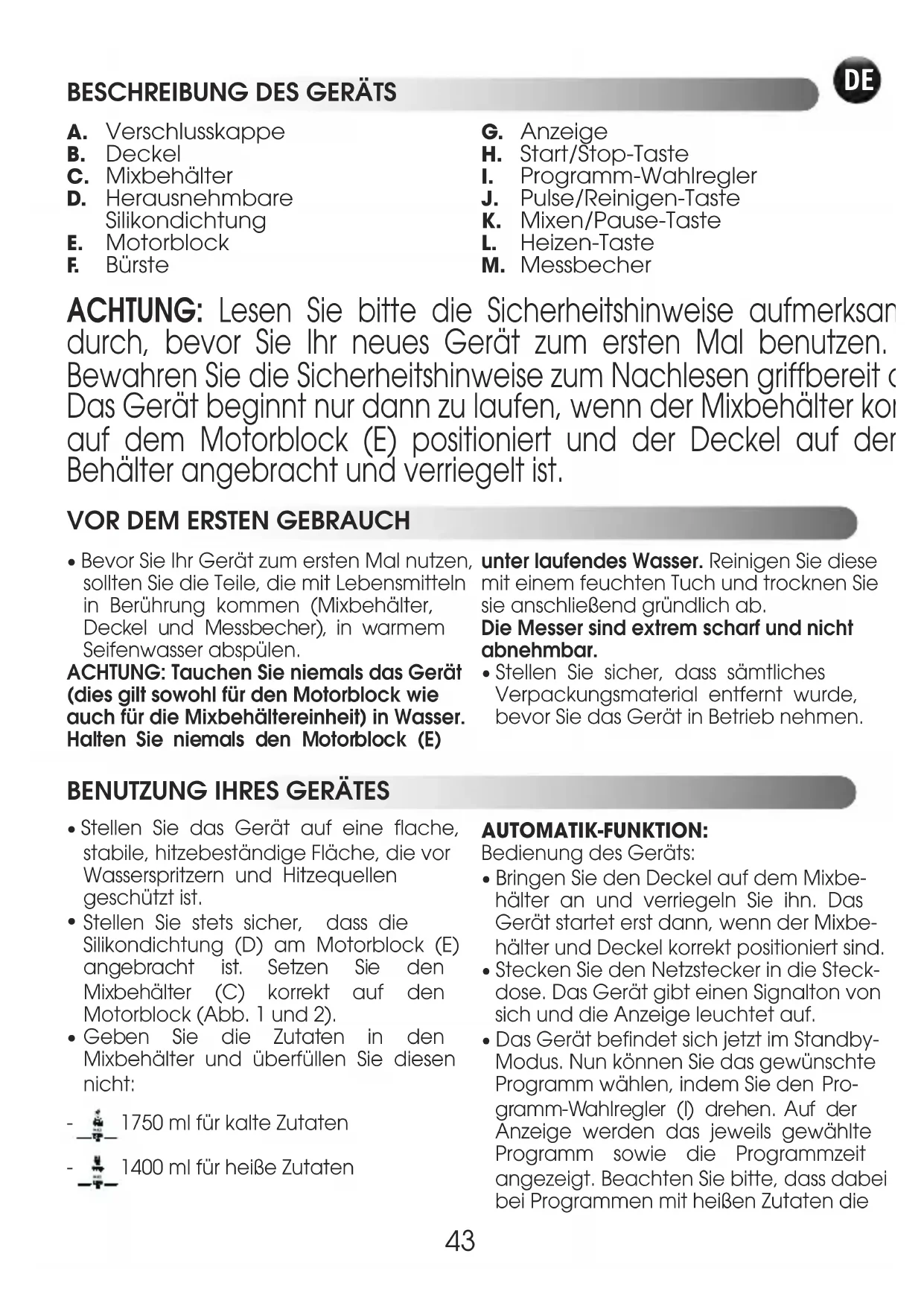- Bevor Sie Ihr Gerät zum ersten Mal nutzen,sollten Sie die Teile, die mit Lebensmittelnin Berührung kommen (Mixbehälter, Deckel und Messbecher), in warmem Seifenwasser abspülen.ACHTUNG: Tauchen Sie niemals das Gerät(dies gilt sowohl für den Motorblock wieauch für die Mixbehältereinheit) in Wasser. Halten Sie niemals den Motorblock (E) unter laufendes Wasser. Reinigen Sie diesemit einem feuchten Tuch und trocknen Siesie anschließend gründlich ab.Die Messer sind extrem scharf und nichtabnehmbar.• Stellen Sie sicher, dass sämtlichesVerpackungsmaterial entfernt wurde,bevor Sie das Gerät in Betrieb nehmen. ACHTUNG: Lesen Sie bitte die Sicherheitshinweise aufmerksam durch, bevor Sie Ihr neues Gerät zum ersten Mal benutzen. Bewahren Sie die Sicherheitshinweise zum Nachlesen griffbereit auf. Das Gerät beginnt nur dann zu laufen, wenn der Mixbehälter korrekt auf dem Motorblock (E) positioniert und der Deckel auf dem Behälter angebracht und verriegelt ist.
