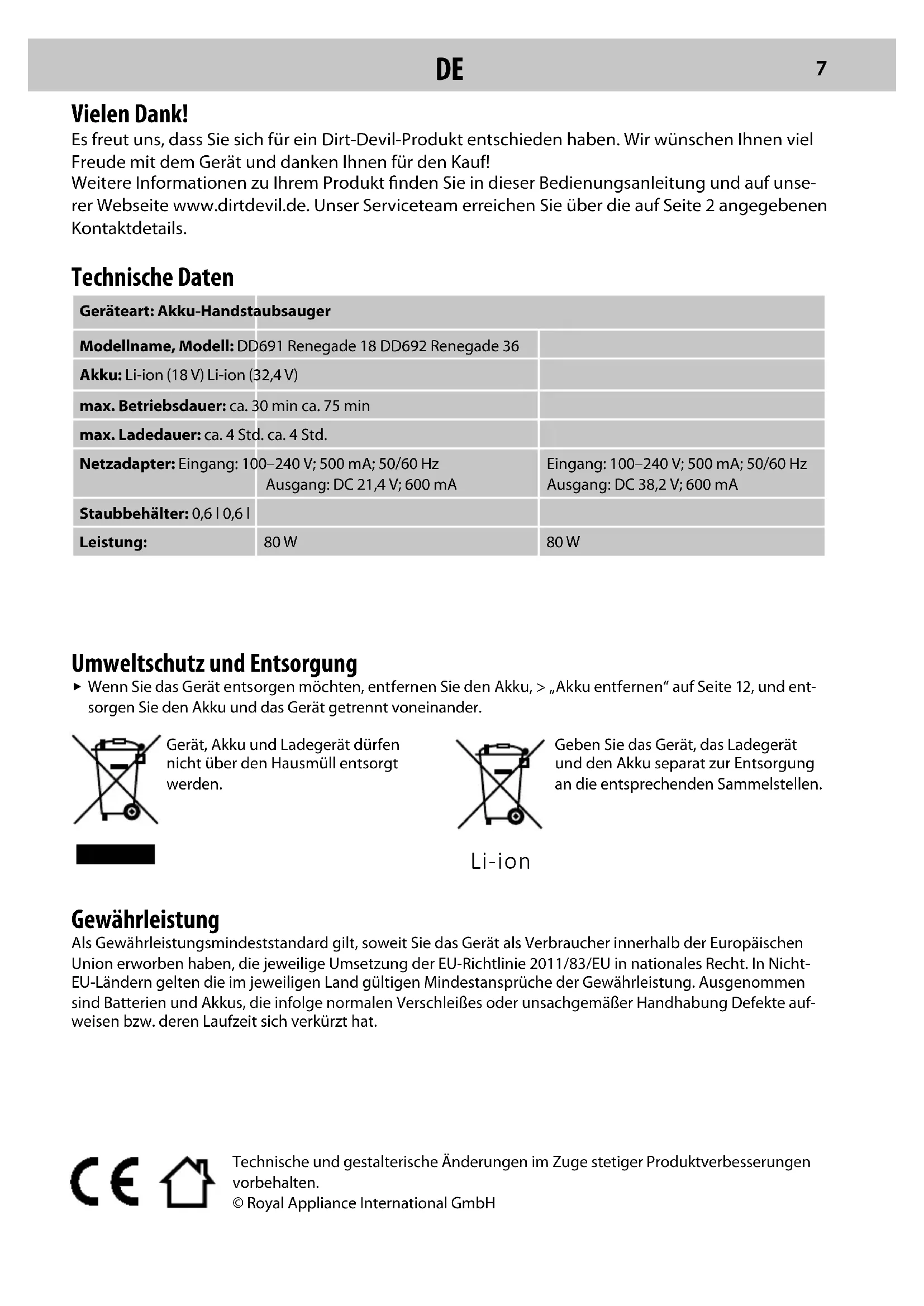 Wenn Sie das Gerät entsorgen möchten, entfernen Sie den Akku, > „Akku entfernen“ auf Seite 12, und ent- sorgen Sie den Akku und das Gerät getrennt voneinander.Gerät, Akku und Ladegerät dürfen nicht über den Hausmüll entsorgt werden.Geben Sie das Gerät, das Ladegerät und den Akku separat zur Entsorgung an die entsprechenden Sammelstellen. Gewährleistung Als Gewährleistungsmindeststandard gilt, soweit Sie das Gerät als Verbraucher innerhalb der Europäischen Union erworben haben, die jeweilige Umsetzung der EU-Richtlinie 2011/83/EU in nationales Recht. In Nicht-EU-Ländern gelten die im jeweiligen Land gültigen Mindestansprüche der Gewährleistung. Ausgenommen sind Batterien und Akkus, die infolge normalen Verschleißes oder unsachgemäßer Handhabung Defekte auf-weisen bzw. deren Laufzeit sich verkürzt hat. Li-ion Technische und gestalterische Änderungen im Zuge stetiger Produktverbesserungen vorbehalten.© Royal Appliance International GmbH Technische Daten Geräteart: Akku-HandstaubsaugerModellname, Modell: DD691 Renegade 18 DD692 Renegade 36Akku: Li-ion (18 V) Li-ion (32,4 V)max. Betriebsdauer: ca. 30 min ca. 75 minmax. Ladedauer: ca. 4 Std. ca. 4 Std.Netzadapter: Eingang: 100–240 V; 500 mA; 50/60 HzAusgang: DC 21,4 V; 600 mAEingang: 100–240 V; 500 mA; 50/60 HzAusgang: DC 38,2 V; 600 mAStaubbehälter: 0,6 l 0,6 lLeistung: 80 W 80 W Vielen Dank! Es freut uns, dass Sie sich für ein Dirt-Devil-Produkt entschieden haben. Wir wünschen Ihnen viel Freude mit dem Gerät und danken Ihnen für den Kauf! Weitere Informationen zu Ihrem Produkt nden Sie in dieser Bedienungsanleitung und auf unse- rer Webseite www.dirtdevil.de. Unser Serviceteam erreichen Sie über die auf Seite 2 angegebenen Kontaktdetails.DE