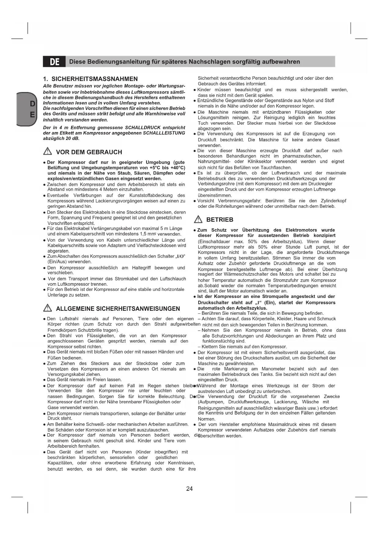 DörDie Verwendung der Druckluft für die vorgesehenen Zwecke (Aufpumpen, Druckluftwerkzeuge, Lackierung, Wäsche mit Reinigungsmitteln auf ausschließlich wässriger Basis usw.) erfordert die Kenntnis und Befolgung der in den einzelnen Fällen geltenden Normen.