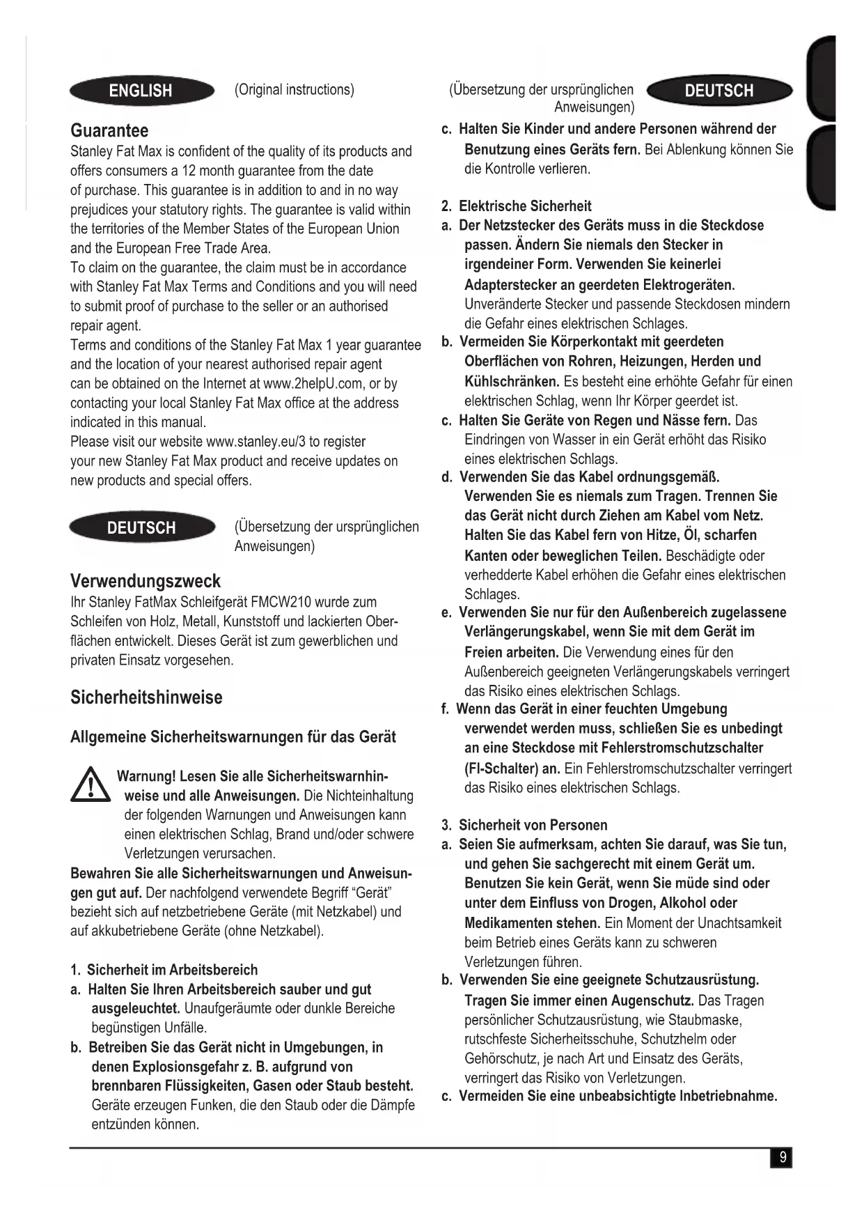 a. Seien Sie aufmerksam, achten Sie darauf, was Sie tun, und gehen Sie sachgerecht mit einem Gerät um. Benutzen Sie kein Gerät, wenn Sie müde sind oder unter dem Einuss von Drogen, Alkohol oder Medikamenten stehen. Ein Moment der Unachtsamkeit beim Betrieb eines Geräts kann zu schweren Verletzungen führen. b. Verwenden Sie eine geeignete Schutzausrüstung. Tragen Sie immer einen Augenschutz. Das Tragen persönlicher Schutzausrüstung, wie Staubmaske, rutschfeste Sicherheitsschuhe, Schutzhelm oder Gehörschutz, je nach Art und Einsatz des Geräts, verringert das Risiko von Verletzungen. c. Vermeiden Sie eine unbeabsichtigte Inbetriebnahme. Guarantee Stanley Fat Max is confident of the quality of its products and offers consumers a 12 month guarantee from the date of purchase. This guarantee is in addition to and in no way prejudices your statutory rights. The guarantee is valid within the territories of the Member States of the European Union and the European Free Trade Area. To claim on the guarantee, the claim must be in accordance with Stanley Fat Max Terms and Conditions and you will need to submit proof of purchase to the seller or an authorised repair agent. Terms and conditions of the Stanley Fat Max 1 year guarantee and the location of your nearest authorised repair agent can be obtained on the Internet at www.2helpU.com, or by contacting your local Stanley Fat Max office at the address indicated in this manual. Please visit our website www.stanley.eu/3 to register your new Stanley Fat Max product and receive updates on new products and special offers.10 (Übersetzung der ursprünglichen Anweisungen) DEUTSCH Vergewissern Sie sich, dass das Gerät ausgeschaltet ist, bevor Sie es an eine Steckdose oder einen Akku anschließen, es hochheben oder tragen. Wenn Sie beim Tragen des Geräts den Finger am Schalter haben oder das Gerät eingeschaltet an die Stromversorgung anschließen, kann dies zu Unfällen führen. d. Entfernen Sie Einstell- oder Schraubenschlüssel, bevor Sie das Gerät einschalten. Werkzeuge oder Schlüssel, die an rotierenden Teilen des Geräts angebracht sind, können zu Verletzungen führen. e. Beugen Sie sich nicht zu weit nach vorne. Sorgen Sie für einen sicheren Stand und halten Sie jederzeit das Gleichgewicht. Dadurch können Sie das Gerät in unerwarteten Situationen besser kontrollieren. f. Tragen Sie geeignete Kleidung. Tragen Sie keine weite Kleidung und keinen Schmuck. Halten Sie Ihre Haare, Kleidung und Handschuhe von beweglichen Teilen fern. Lose sitzende Kleidung, Schmuck oder lange Haare können sich in den beweglichen Teilen verfangen. g. Falls Vorrichtungen zum Absaugen oder Auffangen von Staub vorhanden sind, vergewissern Sie sich, dass diese angeschlossen sind und richtig verwendet werden. Das Verwenden einer Staubauffangvorrichtung verringert Gefährdungen durch Staub.