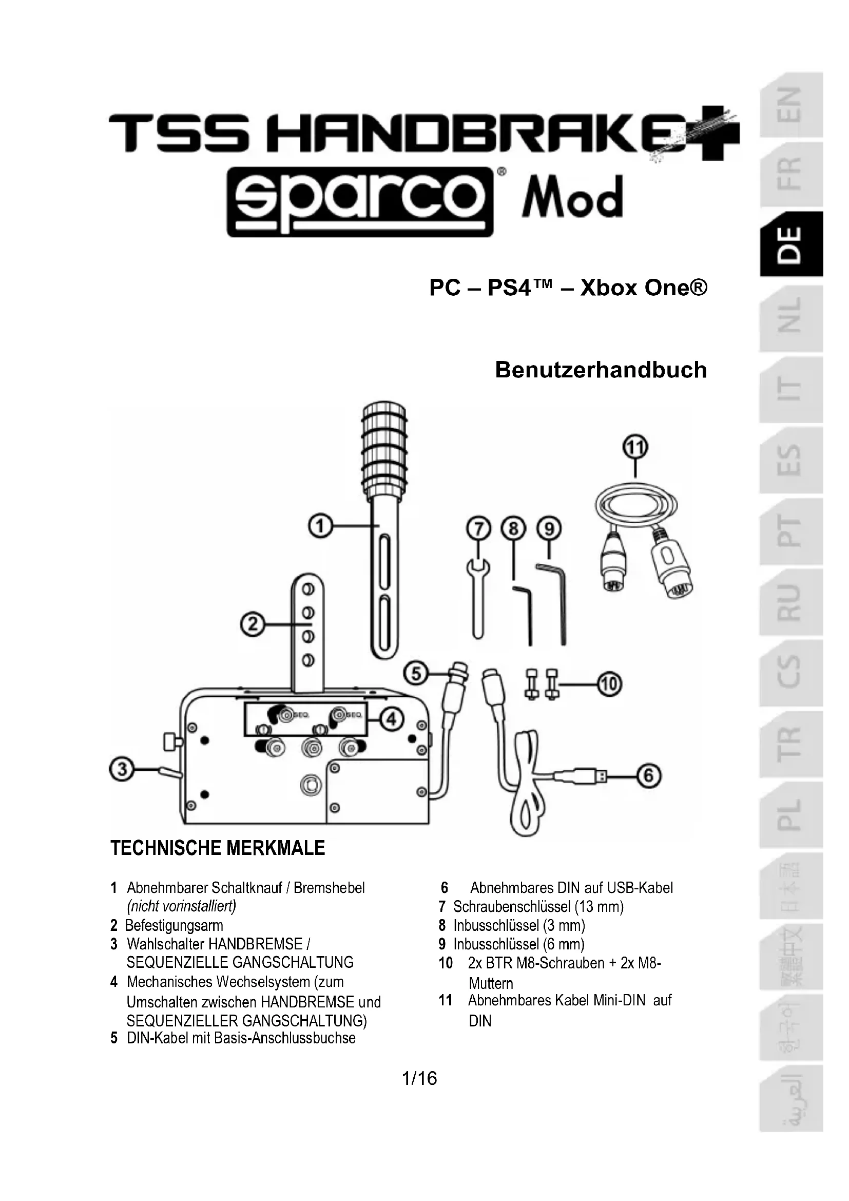 - Eine Liste von PS4™ und Xbox One® Spielen, die mit Handbremsen kompatibel sind, finden Sie auf https://support.thrustmaster.com/ . Wählen Sie bitte im Abschnitt Lenkräder TM SIM HUB oder TSS Handbrake Sparco® Mod aus.11/16