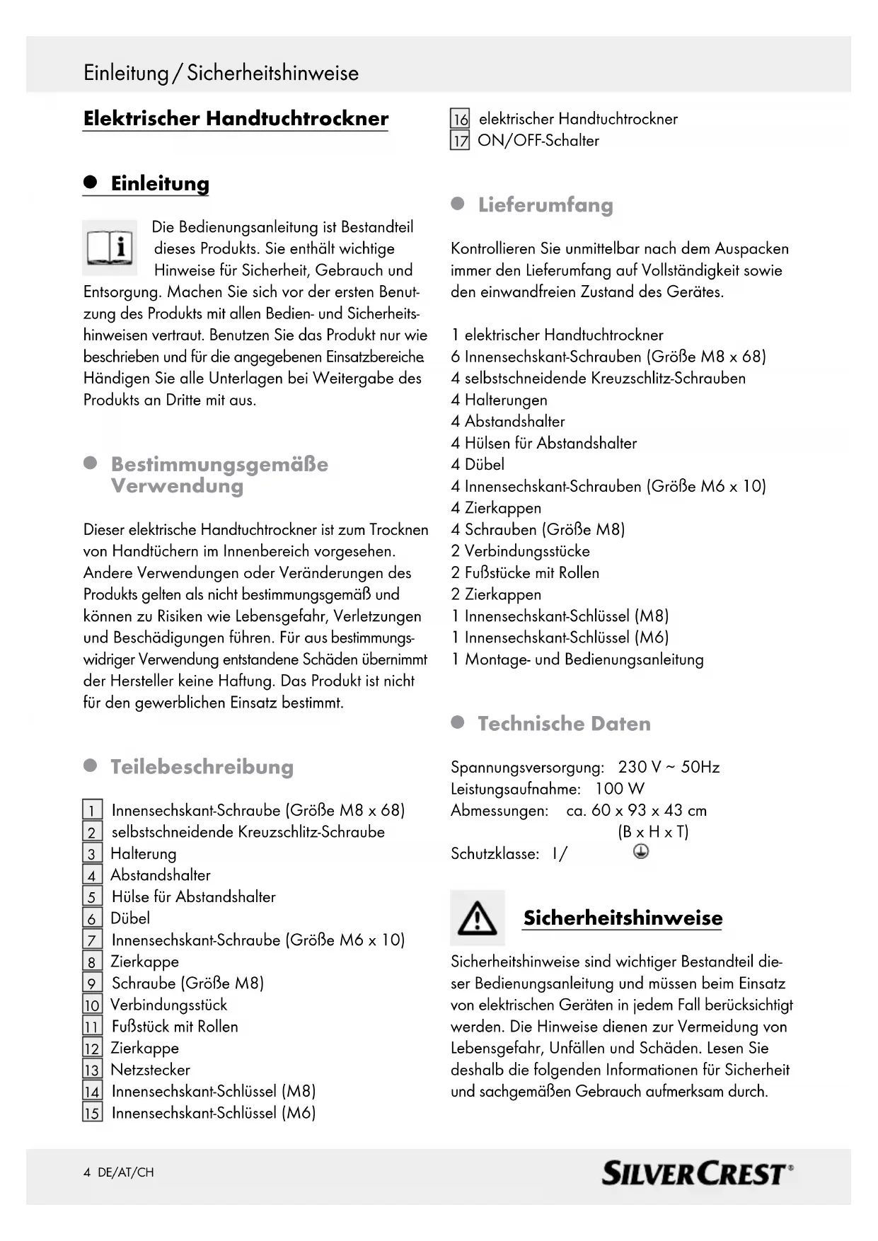 50Hz Leistungsaufnahme: 100 W Abmessungen: ca. 60 x 93 x 43 cm (B x H x T) Schutzklasse: I / Sicherheitshinweise Sicherheitshinweise sind wichtiger Bestandteil die- ser Bedienungsanleitung und müssen beim Einsatz von elektrischen Geräten in jedem Fall berücksichtigt werden. Die Hinweise dienen zur Vermeidung von Lebensgefahr, Unfällen und Schäden. Lesen Sie deshalb die folgenden Informationen für Sicherheit und sachgemäßen Gebrauch aufmerksam durch.5 DE/AT/CH Sicherheitshinweise / Montage