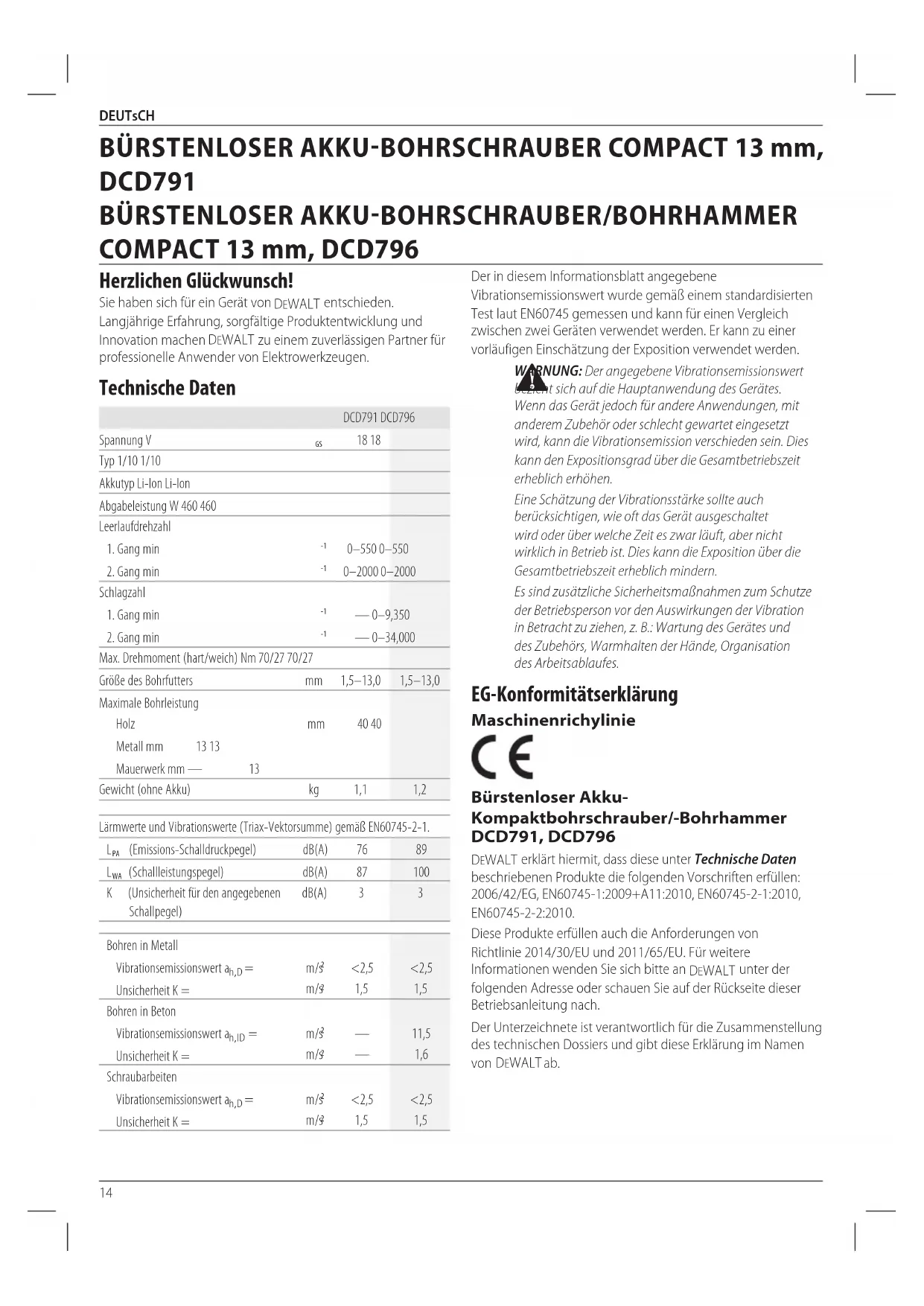 DEWALT erklart hiermit, dass diese unter Technische Daten beschreibenben Produkte die folgenden Vorschriften erfüllen: 2006/42/EG, EN60745-1:2009+A11:2010, EN60745-2-1:2010, EN60745-2-2:2010.