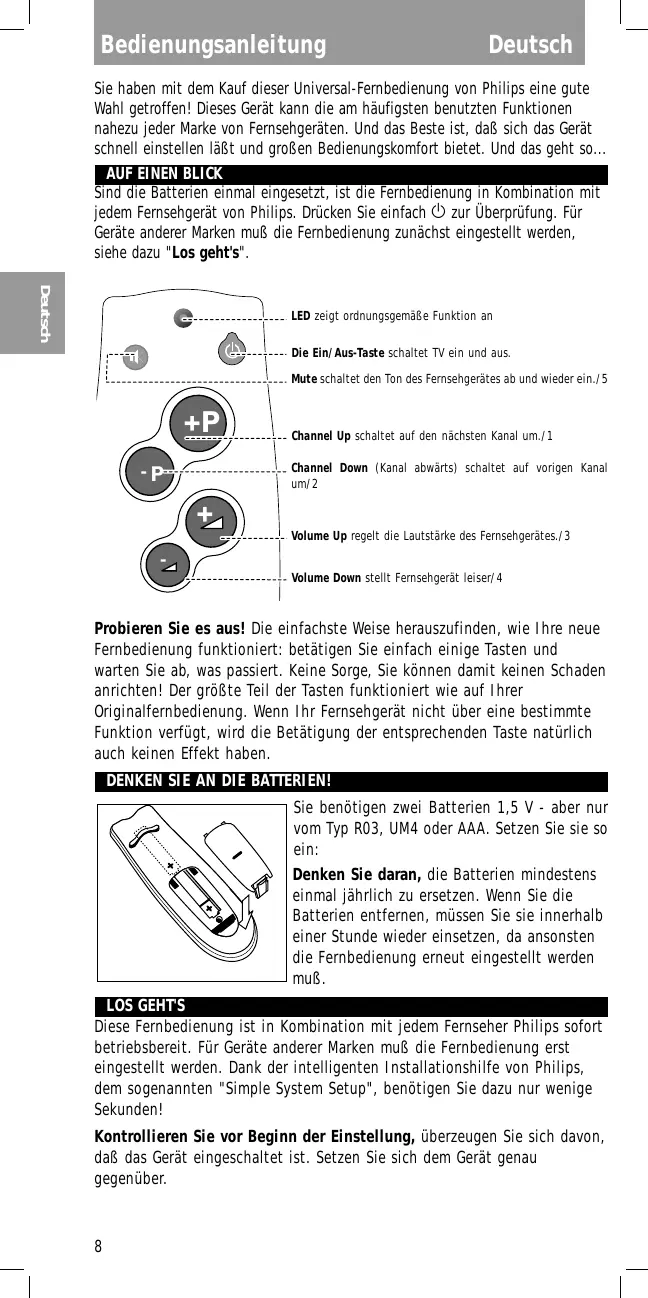 Volume Up regelt die Lautstärke des Fernsehgerätes./3 Volume Down stellt Fernsehgerät leiser/4 Probieren Sie es aus! Die einfachste Weise herauszufinden, wie Ihre neue Fernbedienung funktioniert: betätigen Sie einfach einige Tasten und warten Sie ab, was passiert. Keine Sorge, Sie können damit keinen Schaden anrichten! Der größte Teil der Tasten funktioniert wie auf Ihrer Originalfernbedienung. Wenn Ihr Fernsehgerät nicht über eine bestimmte Funktion verfügt, wird die Betätigung der entsprechenden Taste natürlich auch keinen Effekt haben. DENKEN SIE AN DIE BATTERIEN! Sie benötigen zwei Batterien 1,5 V - aber nur vom Typ R03, UM4 oder AAA. Setzen Sie sie so ein: Denken Sie daran, die Batterien mindestens einmal jährlich zu ersetzen. Wenn Sie die Batterien entfernen, müssen Sie sie innerhalb einer Stunde wieder einsetzen, da ansonsten die Fernbedienung erneut eingestellt werden muß. LOS GEHT'S Diese Fernbedienung ist in Kombination mit jedem Fernseher Philips sofort betriebsbereit. Für Geräte anderer Marken muß die Fernbedienung erst eingestellt werden. Dank der intelligenten Installationshilfe von Philips, dem sogenannten "Simple System Setup", benötigen Sie dazu nur wenige Sekunden! Kontrollieren Sie vor Beginn der Einstellung, überzeugen Sie sich davon, daß das Gerät eingeschaltet ist. Setzen Sie sich dem Gerät genau gegenüber.