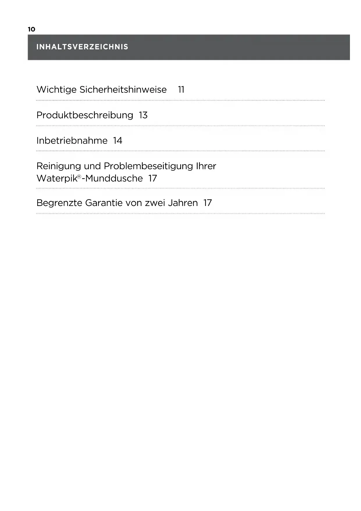 Water Pik, Inc. garantiert dem Originalkaufer/ Besitzer diesen Produkts, dass das Produkt für zwei Jahre ab Kaufdatum frei von Material- und Verarbeitungsfehlern ist.itte haben Sie ihre Quittung/Rechnung als Nachweis des Kaufdatumsauf.Water Pik, Inc. behalt sich das Recht vor, vom reklamierenden Kunden zu verlangen, das Produkt fur die Analyse zurückzusenden, damit wir bestätigkeiten konnen, dass die angegebenen Mangel durch unsere Garantiebestimmungen gedeckt sind. Wir werden jedem Teil des Produkts ersetzen, das unserer Meinung nach fehlerhaft ist, sofern das Produkt nicht falsch angewendet, missbrächlich verwendet, verändert, oder nach dem Kauf beschadigt wurde und wenn es entsprechend dieser Anleitung verwendet wurde. Reparatur oder Ersatzleistungen fur die Garantie werden von ortlichen Handlern ausgeführt, deren Kontaktdaten auf www.waterpik.com/intl gefunden werden konnen. These Garantie schlieBt Zubehor oder VerschleiBteile, wie Aufsätze, usw. aus.