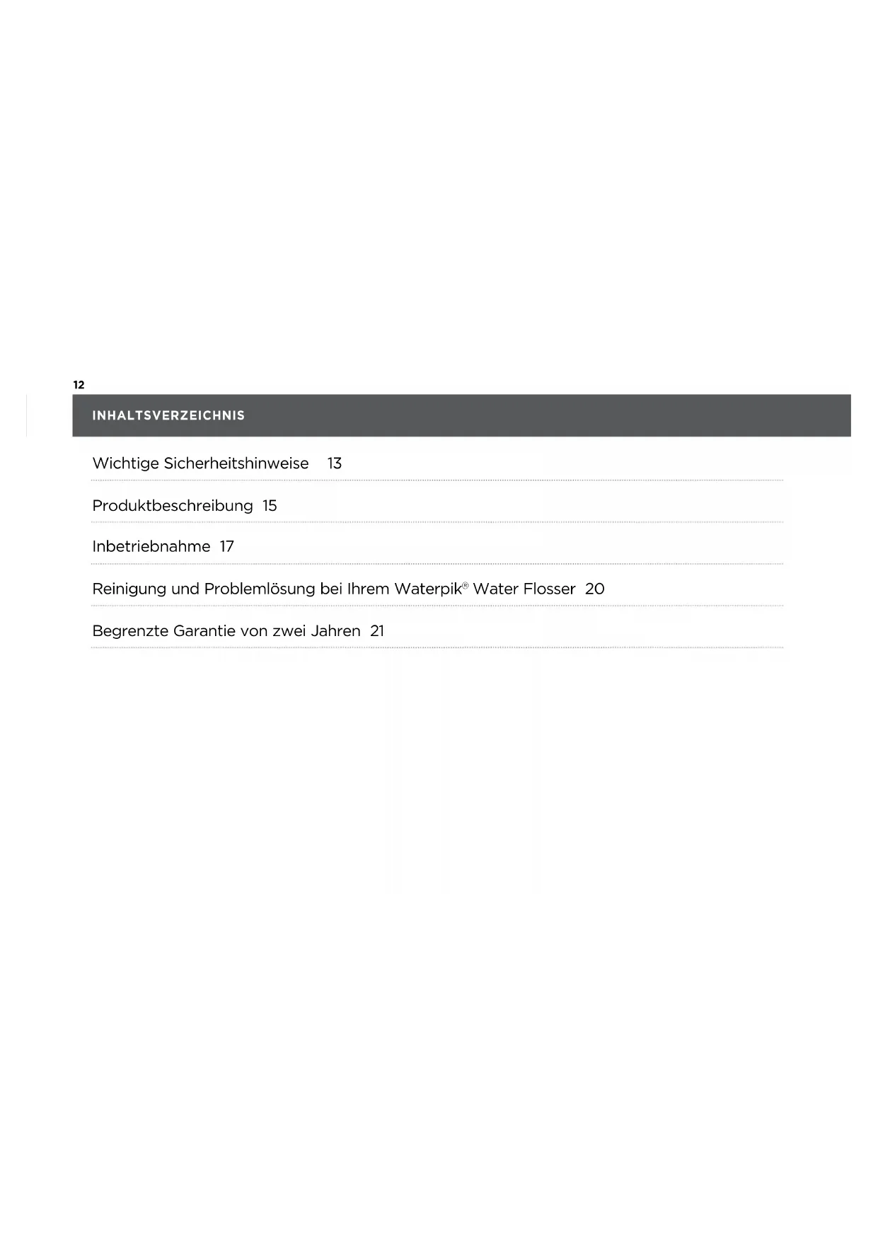 Waterpik® Mundduschen enthalten keine vom Verbraucher zu wartenden elektrischen Teile und bereits keine regelmäßige Wartung. Serviceanfragen richten Sieitte an den Vertriebshandler in ihrem Land. Die Anschriftfinden Sie unter www.waterpik.com/intl.itte senden Sied das Produkt nicht an Niederlassungen von Waterpik International, Inc., da sich dadurch der Service verzogert.