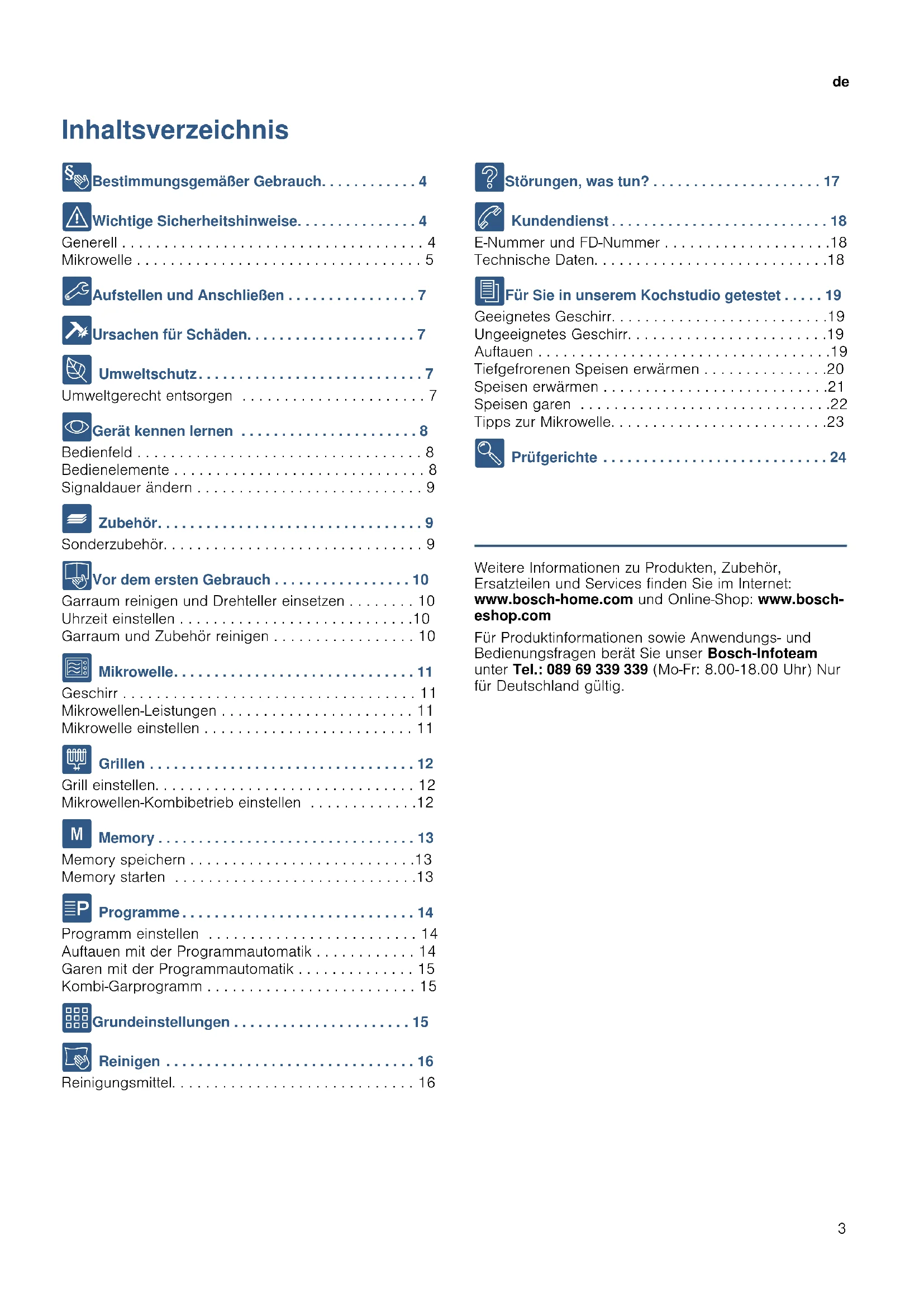 - Gerät kennen lernen . . . . . . . . . . . . . . . . . . . . . . 8 Bedienfeld . . . . . . . . . . . . . . . . . . . . . . . . . . . . . . . . . . 8 Bedienelemente . . . . . . . . . . . . . . . . . . . . . . . . . . . . . . 8 Signaldauer ändern . . . . . . . . . . . . . . . . . . . . . . . . . . . 9 _ Zubehör. . . . . . . . . . . . . . . . . . . . . . . . . . . . . . . . . 9 Sonderzubehör. . . . . . . . . . . . . . . . . . . . . . . . . . . . . . . 9 K Vor dem ersten Gebrauch . . . . . . . . . . . . . . . . . 10 Garraum reinigen und Drehteller einsetzen . . . . . . . . 10 Uhrzeit einstellen . . . . . . . . . . . . . . . . . . . . . . . . . . . .10 Garraum und Zubehör reinigen . . . . . . . . . . . . . . . . . 10 ^ Mikrowelle. . . . . . . . . . . . . . . . . . . . . . . . . . . . . . 11 Geschirr . . . . . . . . . . . . . . . . . . . . . . . . . . . . . . . . . . . 11 Mikrowellen-Leistungen . . . . . . . . . . . . . . . . . . . . . . . 11 Mikrowelle einstellen . . . . . . . . . . . . . . . . . . . . . . . . . 11 d Grillen . . . . . . . . . . . . . . . . . . . . . . . . . . . . . . . . . 12 Grill einstellen. . . . . . . . . . . . . . . . . . . . . . . . . . . . . . . 12 Mikrowellen-Kombibetrieb einstellen . . . . . . . . . . . . .12 B Memory . . . . . . . . . . . . . . . . . . . . . . . . . . . . . . . . 13 Memory speichern . . . . . . . . . . . . . . . . . . . . . . . . . . .13 Memory starten . . . . . . . . . . . . . . . . . . . . . . . . . . . . .13 P Programme . . . . . . . . . . . . . . . . . . . . . . . . . . . . . 14 Programm einstellen . . . . . . . . . . . . . . . . . . . . . . . . . 14 Auftauen mit der Programmautomatik . . . . . . . . . . . . 14 Garen mit der Programmautomatik . . . . . . . . . . . . . . 15 Kombi-Garprogramm . . . . . . . . . . . . . . . . . . . . . . . . . 15 Q Grundeinstellungen . . . . . . . . . . . . . . . . . . . . . . 15 D Reinigen . . . . . . . . . . . . . . . . . . . . . . . . . . . . . . . 16 Reinigungsmittel. . . . . . . . . . . . . . . . . . . . . . . . . . . . . 16 3 Störungen, was tun? . . . . . . . . . . . . . . . . . . . . . 17 4 Kundendienst . . . . . . . . . . . . . . . . . . . . . . . . . . . 18 E-Nummer und FD-Nummer . . . . . . . . . . . . . . . . . . . .18 Technische Daten. . . . . . . . . . . . . . . . . . . . . . . . . . . .18 J Für Sie in unserem Kochstudio getestet . . . . . 19 Geeignetes Geschirr. . . . . . . . . . . . . . . . . . . . . . . . . .19 Ungeeignetes Geschirr. . . . . . . . . . . . . . . . . . . . . . . .19 Auftauen . . . . . . . . . . . . . . . . . . . . . . . . . . . . . . . . . . .19 Tiefgefrorenen Speisen erwärmen . . . . . . . . . . . . . . .20 Speisen erwärmen . . . . . . . . . . . . . . . . . . . . . . . . . . .21 Speisen garen . . . . . . . . . . . . . . . . . . . . . . . . . . . . . .22 Tipps zur Mikrowelle. . . . . . . . . . . . . . . . . . . . . . . . . .23 E Prüfgerichte . . . . . . . . . . . . . . . . . . . . . . . . . . . . 24 Produktinfo Weitere Informationen zu Produkten, Zubehör, Ersatzteilen und Services finden Sie im Internet: www.bosch-home.com und Online-Shop: www.bosch- eshop.com Für Produktinformationen sowie Anwendungs- und Bedienungsfragen berät Sie unser Bosch-Infoteam unter Tel.: 089 69 339 339 (Mo-Fr: 8.00-18.00 Uhr) Nur für Deutschland gültig.de Bestimmungsgemäßer Gebrauch
