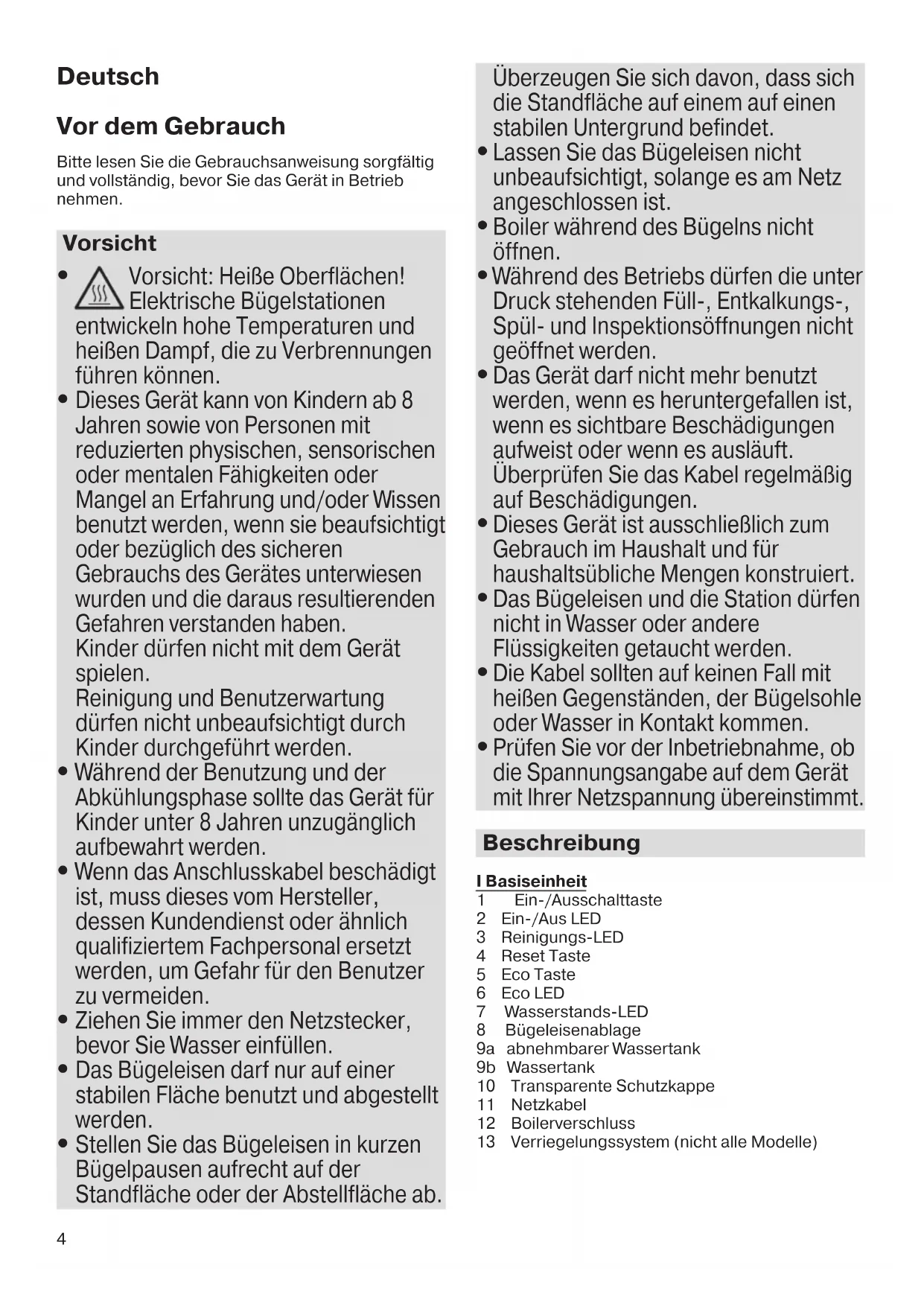 - Das Bügeleisen und die Station dürfen nicht in Wasser oder andere Flüssigkeiten getaucht werden.