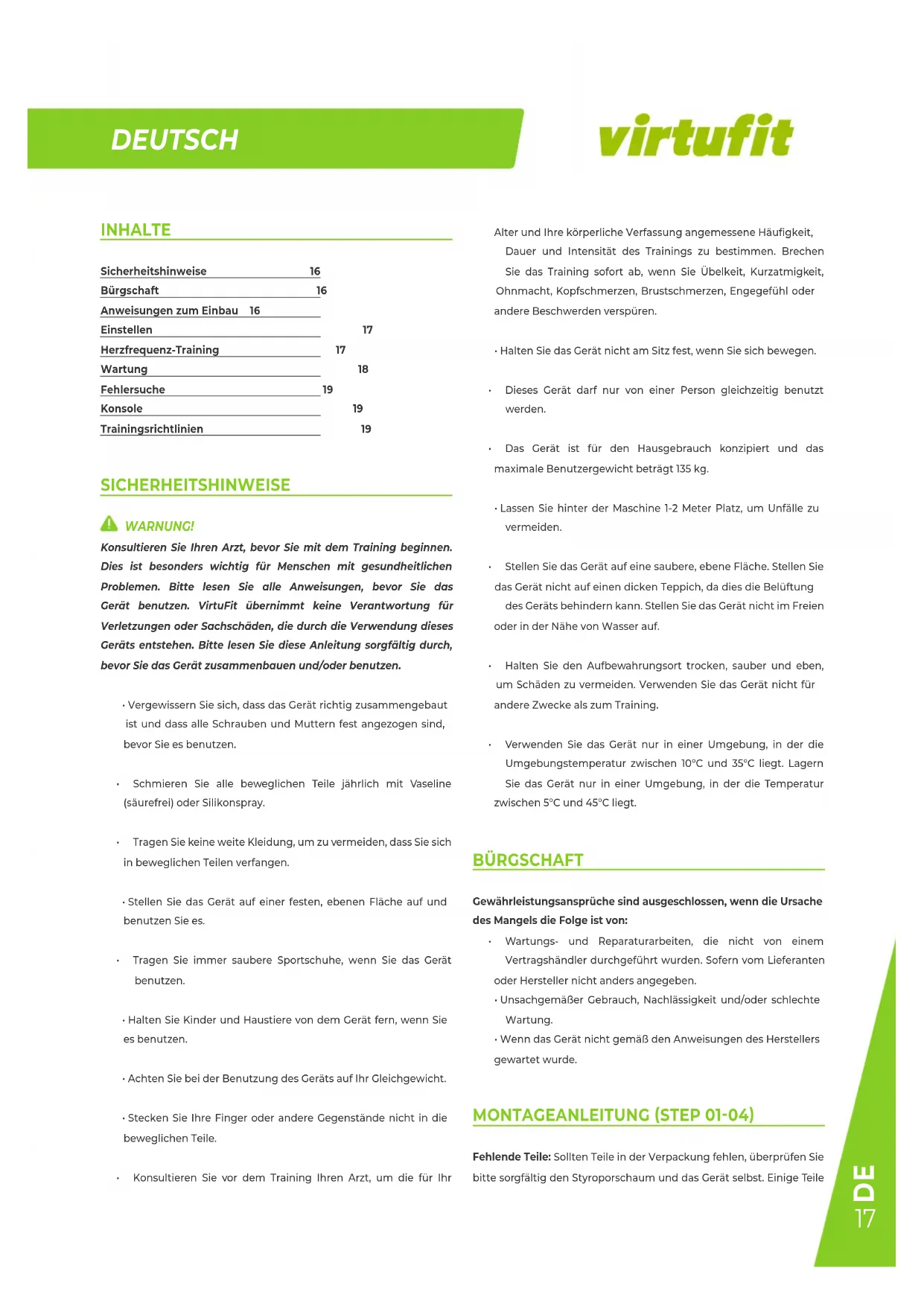 Konsultieren Sie ihren Arzt, bevor Sie mit dem Training beginnen. Dies ist besonderss wichtig für Menschen mit gesundheitlichen Problemen.itte lessen Si alle Anweisungen,behvor Sie das Gerat benutzen.VirtuFit ubernimmt keine Verantwortung fur Verletzungen oder Sachschaden, die durch die Verwendung dieseres Gerats entstehen.itte lessen Si diese Anleitung sorgfaltig durch, bevor Sie das Gerat zusammenbauen und/oder benutzen.