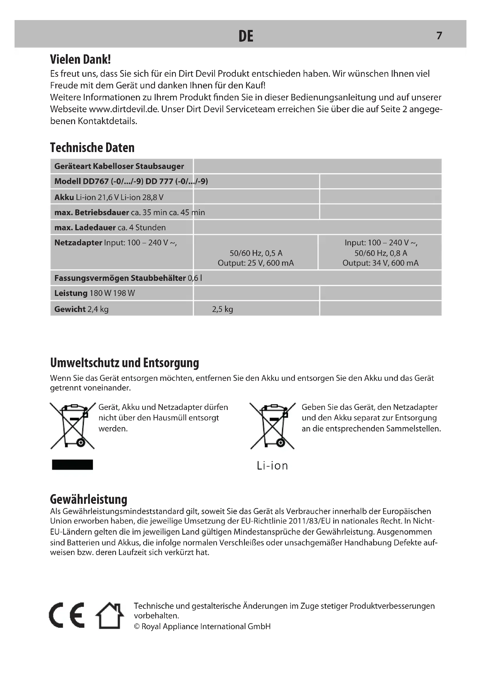 6Technische und gestalterische Änderungen im Zuge stetiger Produktverbesserungen vorbehalten.© Royal Appliance International GmbH Vielen Dank! Es freut uns, dass Sie sich für ein Dirt Devil Produkt entschieden haben. Wir wünschen Ihnen viel Freude mit dem Gerät und danken Ihnen für den Kauf! Weitere Informationen zu Ihrem Produkt nden Sie in dieser Bedienungsanleitung und auf unserer Webseite www.dirtdevil.de. Unser Dirt Devil Serviceteam erreichen Sie über die auf Seite 2 angege- benen Kontaktdetails. Technische Daten Geräteart Kabelloser StaubsaugerModell DD767 (-0/.../-9) DD 777 (-0/.../-9)Akku Li-ion 21,6 V Li-ion 28,8 Vmax. Betriebsdauer ca. 35 min ca. 45 minmax. Ladedauer ca. 4 StundenNetzadapter Input: 100 – 240 V ~, 50/60 Hz, 0,5 A Output: 25 V, 600 mAInput: 100 – 240 V ~, 50/60 Hz, 0,8 A Output: 34 V, 600 mAFassungsvermögen Staubbehälter 0,6 lLeistung 180 W 198 WGewicht 2,4 kg 2,5 kg Umweltschutz und Entsorgung Wenn Sie das Gerät entsorgen möchten, entfernen Sie den Akku und entsorgen Sie den Akku und das Gerät getrennt voneinander.Gerät, Akku und Netzadapter dürfen nicht über den Hausmüll entsorgt werden.Geben Sie das Gerät, den Netzadapter und den Akku separat zur Entsorgung an die entsprechenden Sammelstellen. Gewährleistung Als Gewährleistungsmindeststandard gilt, soweit Sie das Gerät als Verbraucher innerhalb der Europäischen Union erworben haben, die jeweilige Umsetzung der EU-Richtlinie 2011/83/EU in nationales Recht. In Nicht-EU-Ländern gelten die im jeweiligen Land gültigen Mindestansprüche der Gewährleistung. Ausgenommen sind Batterien und Akkus, die infolge normalen Verschleißes oder unsachgemäßer Handhabung Defekte auf-weisen bzw. deren Laufzeit sich verkürzt hat. Li-ion