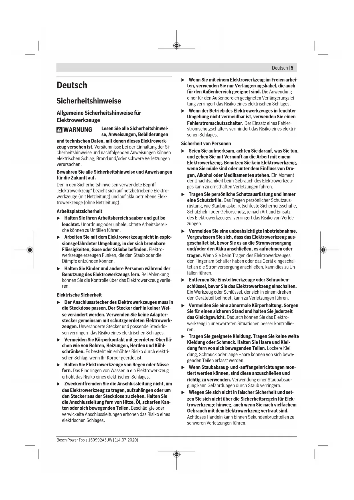 r einen sicheren Stand und halten Sie jederzeit das Gleichgewicht. Dadurch können Sie das Elektro- werkzeug in unerwarteten Situationen besser kontrollie- ren. u Tragen Sie geeignete Kleidung. Tragen Sie keine weite Kleidung oder Schmuck. Halten Sie Haare und Klei- dung fern von sich bewegenden Teilen. Lockere Klei- dung, Schmuck oder lange Haare können von sich bewe- genden Teilen erfasst werden. u Wenn Staubabsaug- und -auffangeinrichtungen mon- tiert werden können, sind diese anzuschließen und richtig zu verwenden. Verwendung einer Staubabsau- gung kann Gefährdungen durch Staub verringern. u Wiegen Sie sich nicht in falscher Sicherheit und set- zen Sie sich nicht über die Sicherheitsregeln für Elek- trowerkzeuge hinweg, auch wenn Sie nach vielfachem Gebrauch mit dem Elektrowerkzeug vertraut sind. Achtloses Handeln kann binnen Sekundenbruchteilen zu schweren Verletzungen führen. Bosch Power Tools 160992A5UW | (14.07.2020)6 | Deutsch Verwendung und Behandlung des Elektrowerkzeugs u Überlasten Sie das Elektrowerkzeug nicht. Verwenden Sie fu