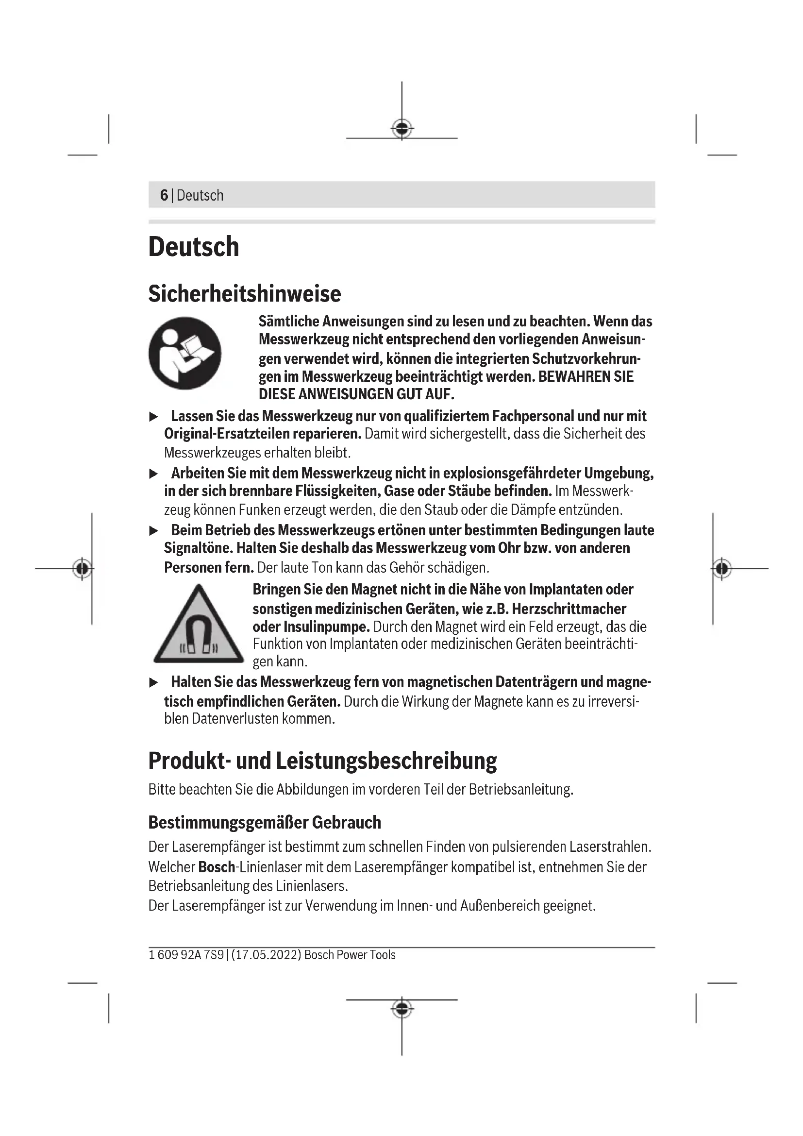 25cm sind, im Einzelhandelsgeschäft oder in unmittelbarer Nähe hierzu unentgelt- lich zurückzunehmen; die Rücknahme darf nicht an den Kauf eines Elektro- oder Elektronikgerätes geknüpft werden und ist auf drei Altgeräte pro Geräteart be- schränkt. Der Vertreiber hat beim Abschluss des Kaufvertrags für das neue Elektro- oder Elektro- nikgerät den Endnutzer über die Möglichkeit zur unentgeltlichen Rückgabe bzw. Abho- lung des Altgeräts zu informieren und den Endnutzer nach seiner Absicht zu befragen, ob bei der Auslieferung des neuen Geräts ein Altgerät zurückgegeben wird. Dies gilt auch bei Vertrieb unter Verwendung von Fernkommunikationsmitteln, wenn die Lager- und Versandflächen für Elektro- und Elektronikgeräte mindestens 400m² betra- gen oder die gesamten Lager- und Versandflächen mindestens 800m² betragen, wobei die unentgeltliche Abholung auf Elektro- und Elektronikgeräte der Kategorien 1 (Wärme- überträger), 2 (Bildschirmgeräte) und 4 (Großgeräte mit mindestens einer äußeren Ab- messung über 50cm) beschränkt ist. Für alle übrigen Elektro- und Elektronikgeräte muss der Vertreiber geeignete Rückgabemöglichkeiten in zumutbarer Entfernung zum je- weiligen Endnutzer gewährleisten; das gilt auch für Altgeräte, die in keiner äußeren Ab- messung größer als 25cm sind, die der Endnutzer zurückgeben will, ohne ein neues Ge- rät zu kaufen. Bosch Power Tools 1 609 92A 7S9 | (17.05.2022)14 | English English Safety Instructions All instructions must be read and observed. The safeguards in- tegrated into the measuring tool may be compromised if the measuring tool is not used in accordance with these instructions. STORE THESE INSTRUCTIONS IN A SAFE PLACE. u Have the measuring tool serviced only by a qualified specialist using only ori- ginal replacement parts. This will ensure that the safety of the measuring tool is maintained. u Do not use the measuring tool in explosive atmospheres which contain flam- mable liquids, gases or dust. Sparks may be produced inside the measuring tool, which can ignite dust or fumes. u When operating the measuring tool, loud signal tones may sound under certain circumstances. For this reason, keep the measuring tool away from your ears and from other persons. The loud sound can damage hearing. Keep the magnet away from implants and other medical devices, e.g. pacemakers or insulin pumps. The magnetgenerates a field that can impair the function of implants and medical devices. u Keep the measuring tool away from magnetic storage media and magnetically- sensitive devices. The effect of the magnets can lead to irreversible data loss. Product Description and Specifications Please observe the illustrations at the beginning of this operating manual. Intended Use The laser receiver is intended to quickly find pulsating laser beams. Please refer to the operating instructions for the line laser to see whichBosch line laser is compatible with the laser receiver. The laser receiver is suitable for indoor and outdoor use. 1 609 92A 7S9 | (17.05.2022) Bosch Power ToolsEnglish | 15 Product Features The numbering of the product features refers to the illustration of the laser receiver on the graphics page. (1) Button for adjusting the reception accuracy (2) On/off button (3) Status indicator (4) Audio signal button (5) Speaker (6) "Laser beam above centre line" LED direction indicator (7) LED for centre line (8) "Laser beam below centre line" LED direction indicator (9) Laser beam reception area (10) Magnets (11) Guide groove for holder (12) Centre mark (13) Serial number (14) Battery compartment cover (15) Battery compartment cover locking mechanism (16) Holder