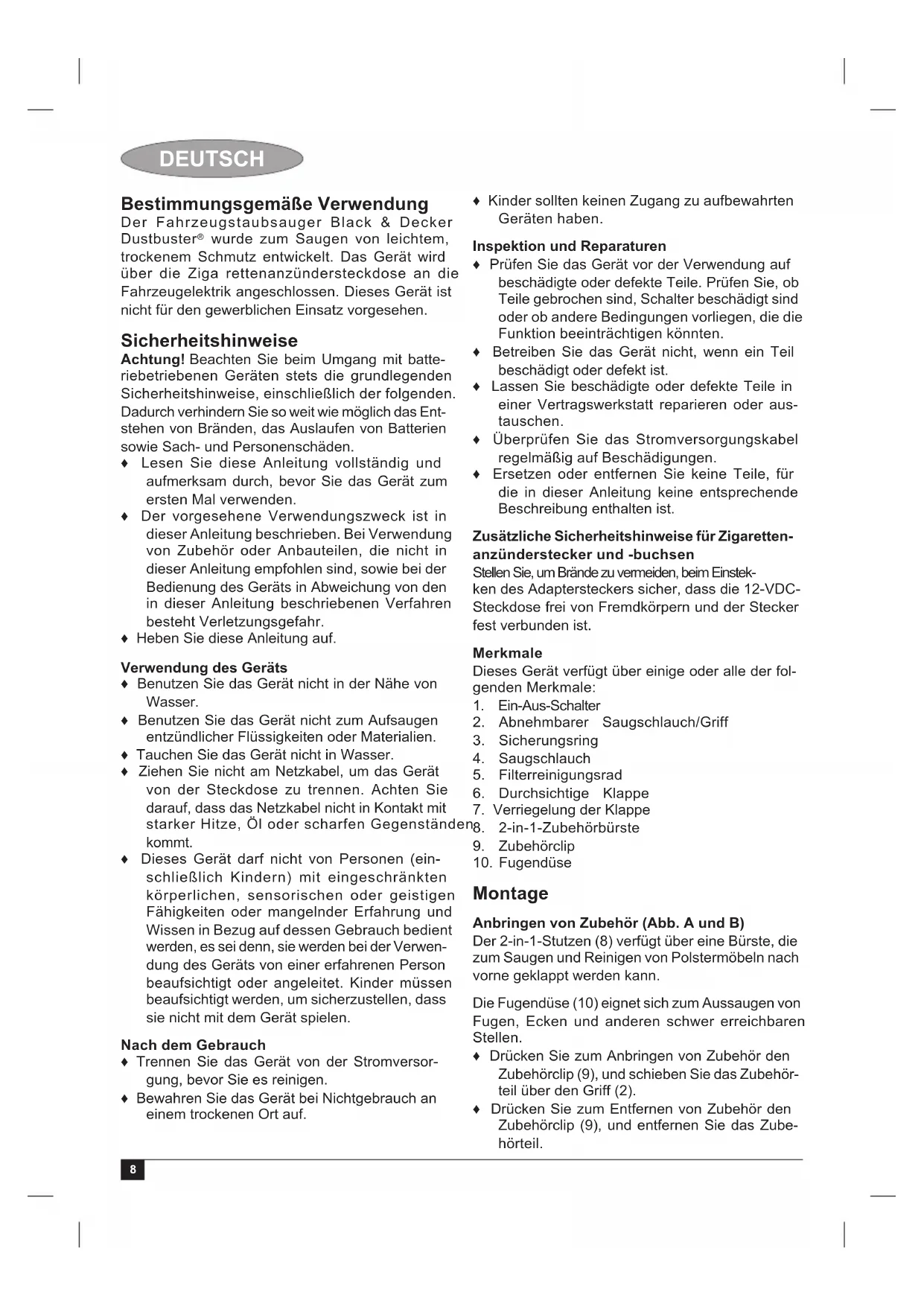 Montage Anbringen von Zubehör (Abb. A und B) Der 2-in-1-Stutzen (8) verfügt über eine Bürste, die zum Saugen und Reinigen von Polstermöbeln nach vorne geklappt werden kann. Die Fugendüse (10) eignet sich zum Aussaugen von Fugen, Ecken und anderen schwer erreichbaren Stellen. ♦ Drücken Sie zum Anbringen von Zubehör den Zubehörclip (9), und schieben Sie das Zubehör- teil über den Griff (2). ♦ Drücken Sie zum Entfernen von Zubehör den Zubehörclip (9), und entfernen Sie das Zube- hörteil.9 DEUTSCH Der Griff (2) kann vom Saugschlauch (4) entfernt werden, damit das Zubehör falls erforderlich un- mittelbar am Saugstutzen (11) angebracht werden kann. So entfernen Sie den Griff: ♦ Öffnen Sie den Clip des Griffs (2) am Gerät. ♦ Drehen Sie den Sicherungsring (3) gegen den Uhrzeigersinn, um die Clips zu lösen. ♦ Ziehen Sie den Saugschlauch (4) vom Griff (2) ab. ♦ Bringen Sie das Zubehörteil unmittelbar am Saugstutzen (11) an. So bringen Sie den Griff wieder an: ♦ Entfernen Sie das Zubehörteil vom Stutzen. ♦ Drücken Sie den Saugschlauch (4) in den Griff (2). Drehen Sie den Sicherungsring (3) im Uhr- zeigersinn, bis dieser einrastet. Gebrauch Anschluss an eine Stromquelle mithilfe des 12-VDCSteckers für Zigarettenanzünder (Abb. C und D) Hinweis: An der Spitze des Steckers befi ndet sich der Pluspol (+) und an der Seite der Minuspol (-). ♦ Ziehen Sie den 12-VDC-Stecker für Zigaretten- anzünder (12) aus dem Aufbewahrungselement (13) an der unteren Seite des Geräts heraus. ♦ Lösen Sie den Kabelclip (14) von der Aufbewah- rungstrommel für das Kabel. ♦ Rollen Sie das Kabel vollständig von der Auf- bewahrungstrommel (15) ab. ♦ Schließen Sie das Gerät an die Stromquelle an, indem Sie den 12-VDC-Stecker für Zigaret- tenanzünder (12) fest in die Anschlussbuchse des Zigarettenanzünders im Fahrzeug oder in eine passende Anschlussbuchse einer anderen Stromquelle stecken. Hinweis: Bei verschiedenen Fahrzeugen kann der Anschluss nur verwendet werden, wenn sich das Zündschloss in die Stellung befi ndet, in der elektri- sche Verbraucher mit Strom versorgt werden. Achtung! Verwenden Sie das Gerät nicht in Elektro- systemen, bei denen die Masse an Plus liegt (z. B. in älteren Fahrzeugen). Achtung! Bei Anschluss mit vertauschter Polung brennt die Sicherung durch, und es können dauer- hafte Schäden am Gerät entstehen. ♦ Nach dem Gebrauch des Geräts: ♦ Ziehen Sie den 12-VDC-Stecker für Zigaretten- anzünder (12) aus der 12-VDC-Buchse. ♦ Rollen Sie das Kabel auf die Aufbewahrungs- trommel (15) auf, und sichern Sie das Kabel mit dem Kabelclip (14). ♦ Verstauen Sie den 12-VDC-Stecker für Ziga- rettenanzünder (12) im Aufbewahrungselement (13) an der unteren Seite des Geräts. Ein- und Ausschalten ♦ Um das Gerät einzuschalten, schieben Sie den Ein-Aus-Schalter (1) nach rechts. ♦ Um das Gerät auszuschalten, schieben Sie den Ein-Aus-Schalter (1) nach links bis dieser in der Stellung „Aus“ einrastet. Das Gerät kann bis zu 30 Minuten benutzt wer- den, ohne dass es die Leistung einer normal aufgeladenen Fahrzeugbatterie in gutem Zustand beeinträchtigt. Achtung! Bei übermäßigem Gebrauch entlädt sich die Batterie schneller. Schalten Sie während des Saugens den Motor des Fahrzeugs aus. Anson- sten kann die Lebensdauer des Geräts verringert werden. Staub saugen ♦ Achten Sie bei der Verwendung des Geräts darauf, dass der Saugschlauch nicht geknickt, verdreht oder verstopft ist. ♦ Der Griff (2) lässt sich einfach vom Gerät ent- fernen. Dies ermöglicht eine Reichweite von bis zu 1,5 m vom Gerät. ♦ Wenn der Griff (2) entfernt wurde, lässt sich das Gerät an dem integrierten Griff transportieren. ♦ Zusätzlich kann der Griff (2) vom Saugschlauch (4) entfernt werden, damit das Zubehör falls erforderlich unmittelbar am Saugstutzen (11) angebracht werden kann. Hinweise für optimale Funktion ♦ Arbeiten Sie auf Treppen immer von unten nach oben. Optimieren der Saugkraft Damit das Gerät stets die bestmögliche Saugkraft erzeugt, müssen die Filter während des Gebrauchs regelmäßig gereinigt werden. ♦ Drehen Sie das Filterreinigungsrad (5) zweimal im Uhrzeigersinn, um die Filter von Staub zu reinigen. ♦ Der Feinpartikelfi lter muss regelmäßig gereinigt werden. Beachten Sie den Abschnitt „Reinigen des Feinpartikelfi lters“. Reinigung und Pfl ege Ihr Black & Decker Gerät wurde im Hinblick auf eine lange Lebensdauer und einen möglichst geringen Wartungsaufwand entwickelt. Ein dauerhafter, einwandfreier Betrieb setzt eine regelmäßige Pfl ege und Reinigung voraus.10 DEUTSCH Achtung! Ziehen Sie den Netzstecker des Geräts aus der Steckdose, bevor Sie mit Wartungs- oder Reinigungsarbeiten am Gerät beginnen. Wischen Sie das Gerät gelegentlich mit einem feuchten Tuch ab. Verwenden Sie keine scheuern- den Reinigungsmittel oder Reinigungsmittel auf Lösungsmittelbasis. Tauchen Sie das Gerät nicht in Wasser. Entleeren des Staubbehälters (Abb. E) Der Staubauffangbehälter muss regelmäßig geleert werden, möglichst nach jeder Verwendung. ♦ Lösen Sie die Taste für die Verriegelung der Klappe (7), und öffnen Sie die durchsichtige Klappe (6) um 180°, bis diese in der geöffneten Stellung einrastet. ♦ Entfernen Sie den Vorfi lter (16). ♦ Leeren Sie den Staubbehälter. ♦ Reinigen Sie den Vorfi lter (16), indem Sie diesen vorsichtig über einem Müllbehälter ausschüt- teln. ♦ Bringen Sie den Vorfi lter (16) wieder an. ♦ Schließen Sie die durchsichtige Klappe (6). Ach- ten Sie darauf, dass die Verriegelung einrastet. Achtung! Waschen Sie den Staubbehälter unter keinen Umständen aus. Achtung! Tauchen Sie das Gerät nicht in Wasser. Reinigen Sie die Geräteoberfläche mit einem feuchten Tuch und Seifenlauge. Wischen Sie die Geräteoberfl äche sorgfältig trocken, bevor Sie das Gerät erneut verwenden oder aufbewahren. Reinigen des Feinpartikelfi lters (Abb. F) Der Feinpartikelfi lter (17) verhindert, dass Staub- pa
