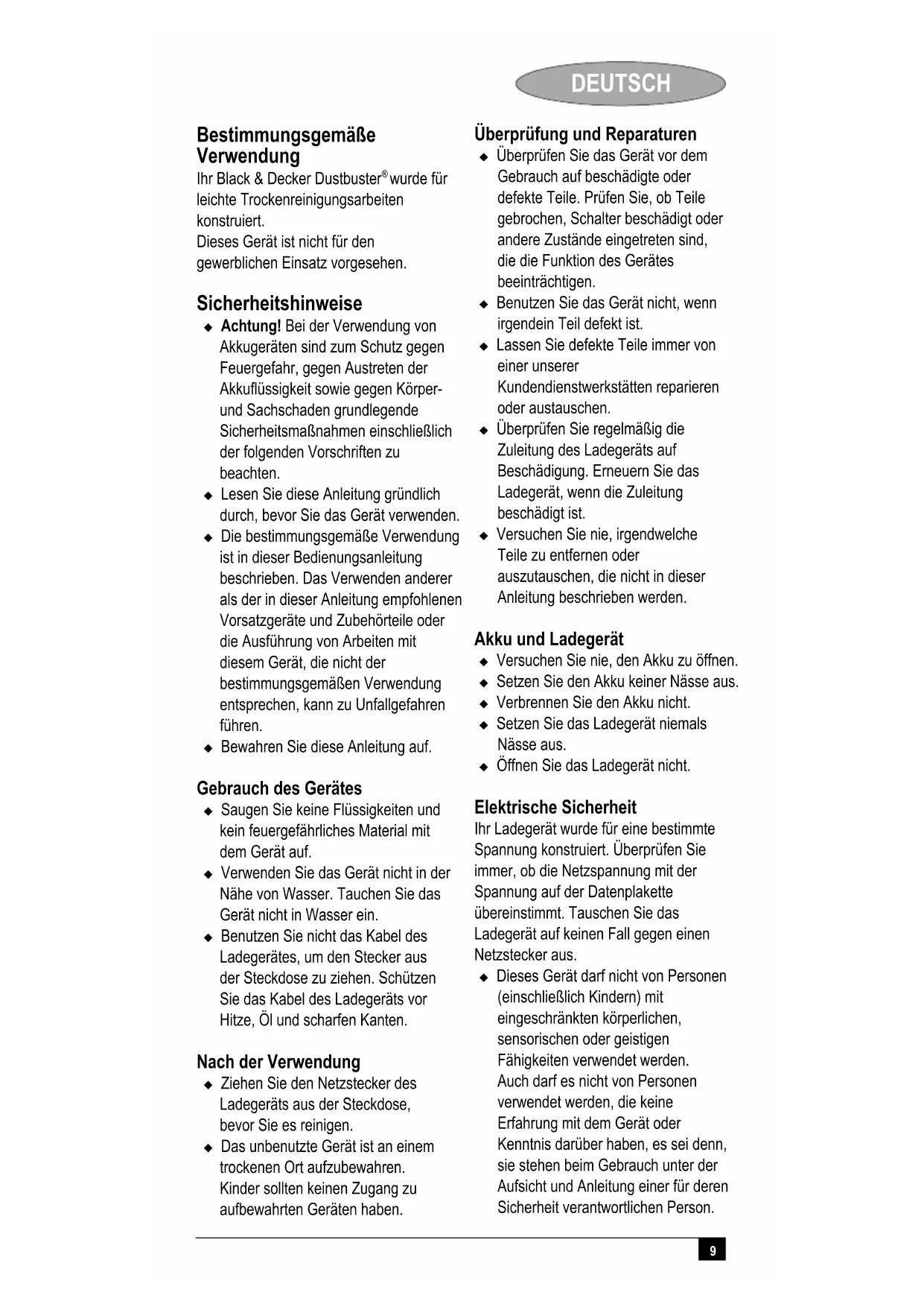 wurde für leichte Trockenreinigungsarbeiten konstruiert. Dieses Gerät ist nicht für den gewerblichen Einsatz vorgesehen. Sicherheitshinweise Achtung! Bei der Verwendung von Akkugeräten sind zum Schutz gegen Feuergefahr, gegen Austreten der Akkuflüssigkeit sowie gegen Körper- und Sachschaden grundlegende Sicherheitsmaßnahmen einschließlich der folgenden Vorschriften zu beachten. Lesen Sie diese Anleitung gründlich durch, bevor Sie das Gerät verwenden. Die bestimmungsgemäße Verwendung ist in dieser Bedienungsanleitung beschrieben. Das Verwenden anderer als der in dieser Anleitung empfohlenen Vorsatzgeräte und Zubehörteile oder die Ausführung von Arbeiten mit diesem Gerät, die nicht der bestimmungsgemäßen Verwendung entsprechen, kann zu Unfallgefahren führen. Bewahren Sie diese Anleitung auf. Gebrauch des Gerätes Saugen Sie keine Flüssigkeiten und kein feuergefährliches Material mit dem Gerät auf. Verwenden Sie das Gerät nicht in der Nähe von Wasser. Tauchen Sie das Gerät nicht in Wasser ein. Benutzen Sie nicht das Kabel des Ladegerätes, um den Stecker aus der Steckdose zu ziehen. Schützen Sie das Kabel des Ladegeräts vor Hitze, Öl und scharfen Kanten. Nach der Verwendung Ziehen Sie den Netzstecker des Ladegeräts aus der Steckdose, bevor Sie es reinigen. Das unbenutzte Gerät ist an einem trockenen Ort aufzubewahren. Kinder sollten keinen Zugang zu aufbewahrten Geräten haben. Überprüfung und Reparaturen Überprüfen Sie das Gerät vor dem Gebrauch auf beschädigte oder defekte Teile. Prüfen Sie, ob Teile gebrochen, Schalter beschädigt oder andere Zustände eingetreten sind, die die Funktion des Gerätes beeinträchtigen. Benutzen Sie das Gerät nicht, wenn irgendein Teil defekt ist. Lassen Sie defekte Teile immer von einer unserer Kundendienstwerkstätten reparieren oder austauschen. Überprüfen Sie regelmäßig die Zuleitung des Ladegeräts auf Beschädigung. Erneuern Sie das Ladegerät, wenn die Zuleitung beschädigt ist. Versuchen Sie nie, irgendwelche Teile zu entfernen oder auszutauschen, die nicht in dieser Anleitung beschrieben werden. Akku und Ladegerät Versuchen Sie nie, den Akku zu öffnen. Setzen Sie den Akku keiner Nässe aus. Verbrennen Sie den Akku nicht. Setzen Sie das Ladegerät niemals Nässe aus. Öffnen Sie das Ladegerät nicht. Elektrische Sicherheit Ihr Ladegerät wurde für eine bestimmte Spannung konstruiert. Überprüfen Sie immer, ob die Netzspannung mit der Spannung auf der Datenplakette übereinstimmt. Tauschen Sie das Ladegerät auf keinen Fall gegen einen Netzstecker aus. Dieses Gerät darf nicht von Personen (einschließlich Kindern) mit eingeschränkten körperlichen, sensorischen oder geistigen Fähigkeiten verwendet werden. Auch darf es nicht von Personen verwendet werden, die keine Erfahrung mit dem Gerät oder Kenntnis darüber haben, es sei denn, sie stehen beim Gebrauch unter der Aufsicht und Anleitung einer für deren Sicherheit verantwortlichen Person.10 DEUTSCH Kinder müssen beaufsichtigt werden, um sicherzustellen, daß sie nicht mit dem Gerät spielen. Symbole auf dem Ladegerät Ihr Ladegerät ist schutzisoliert, daher ist keine Erdleitung erforderlich. Ausfallsicherer Trenntrans- formator. Die Netzspannungs- versorgung ist vom Trans- formatorausgang elektrisch getrennt. Das Ladegerät schaltet automatisch ab, wenn die Umgebungstemperatur zu hoch wird. Danach ist das Ladegerät außer Funktion. Das Gerät muß vom Netz getrennt und zur Reparatur zu einem autorisierten Servicecenter gebracht werden. Das Ladegerät ist ausschließlich für den Gebrauch in geschlossenen Räumen vorgesehen. Lesen Sie diese Anleitung gründlich durch, bevor Sie das Gerät verwenden. Achtung! Bewahren Sie elektrische Geräte außerhalb der Reichweite von Kindern oder schwachen Personen auf. Lassen Sie sie die Geräte niemals ohne Beaufsichtigung benutzen. Merkmale