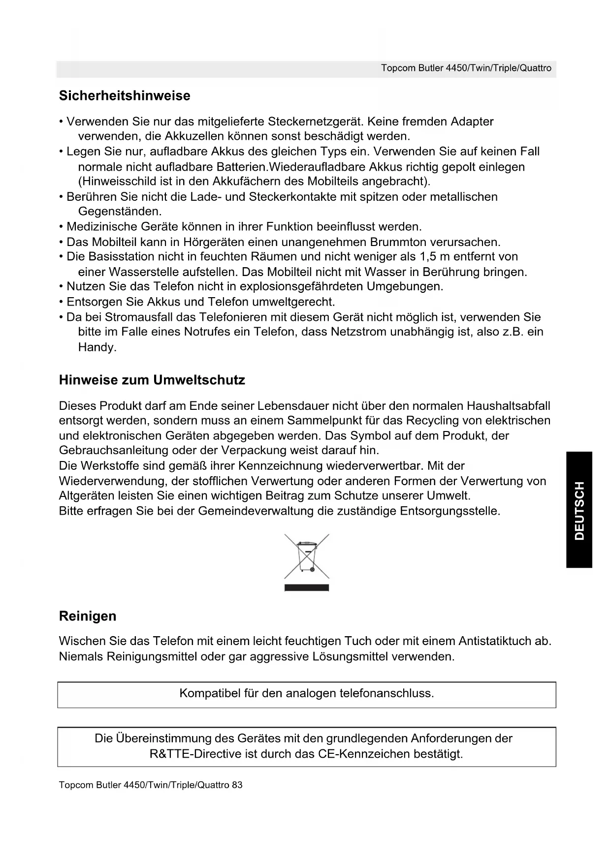 - Da bei Stromausfall das Telefonieren mit diesem Gerät nicht möglich ist, verwenden Sie bitte im Falle eines Notrufes ein Telefon, dass Netzstrom unabhängig ist, also z.B. ein Handy. Hinweise zum Umweltschutz Dieses Produkt darf am Ende seiner Lebensdauer nicht über den normalen Haushaltsabfall entsorgt werden, sondern muss an einem Sammelpunkt für das Recycling von elektrischen und elektronischen Geräten abgegeben werden. Das Symbol auf dem Produkt, der Gebrauchsanleitung oder der Verpackung weist darauf hin. Die Werkstoffe sind gemäß ihrer Kennzeichnung wiederverwertbar. Mit der Wiederverwendung, der stofflichen Verwertung oder anderen Formen der Verwertung von Altgeräten leisten Sie einen wichtigen Beitrag zum Schutze unserer Umwelt. Bitte erfragen Sie bei der Gemeindeverwaltung die zuständige Entsorgungsstelle. Reinigen Wischen Sie das Telefon mit einem leicht feuchtigen Tuch oder mit einem Antistatiktuch ab. Niemals Reinigungsmittel oder gar aggressive Lösungsmittel verwenden. Kompatibel für den analogen telefonanschluss. Die Übereinstimmung des Gerätes mit den grundlegenden Anforderungen der R&TTE-Directive ist durch das CE-Kennzeichen bestätigt.84 Topcom Butler 4450/Twin/Triple/Quattro Topcom Butler 4450/Twin/Triple/Quattro 1 Tasten/LED