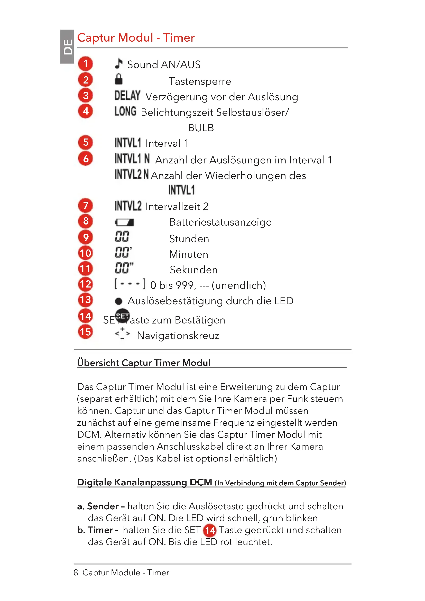 d. DCM ist eingestellt. Schalten Sie den Captur Timer und den Empfänger auf OFF und dann wieder auf ON um die Einstellungen zu speichern.