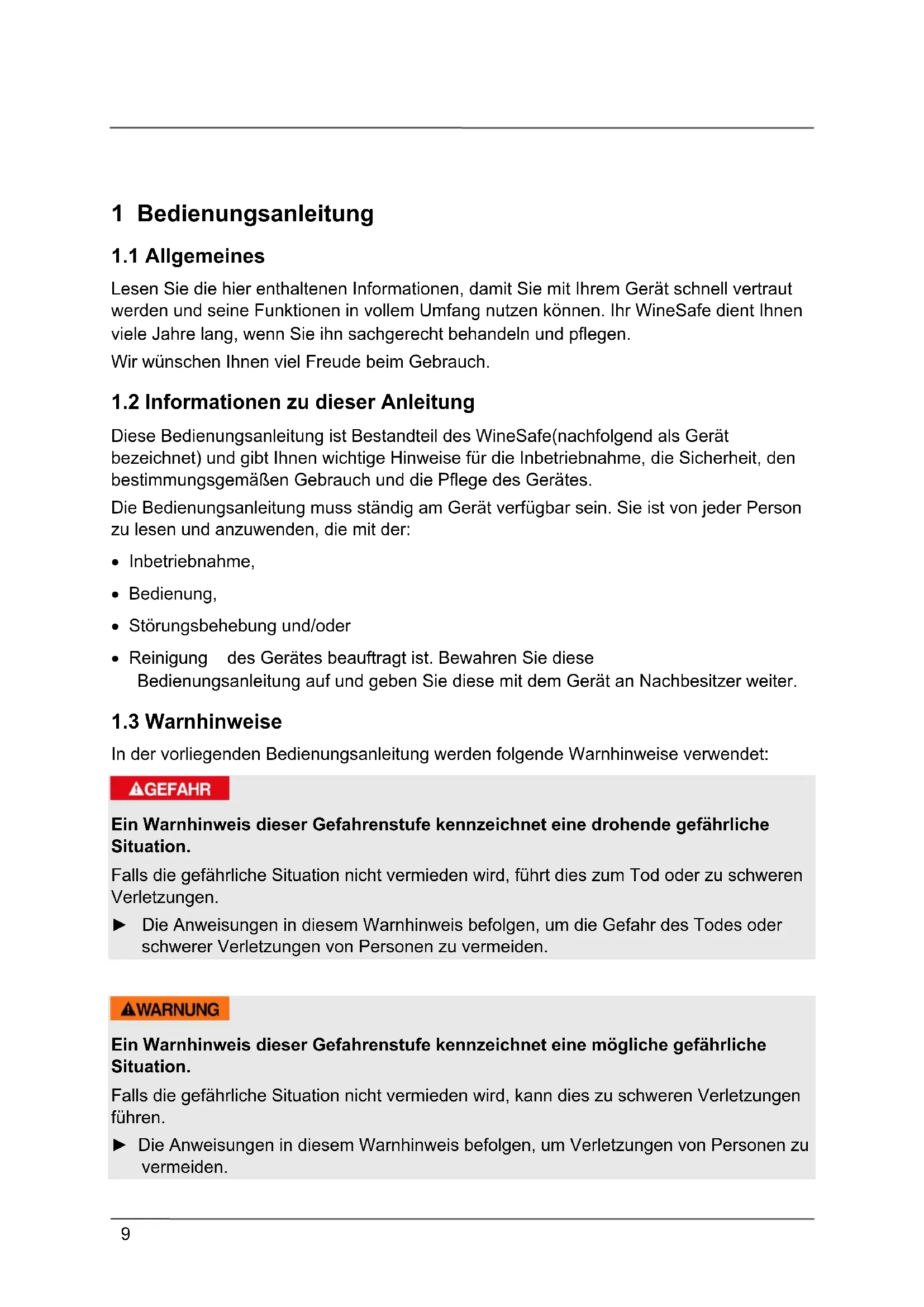 Diese Bedienungsanleitung ist Bestandteil des WineSafe(nachfolgend als Gerät bezeichnet) und gibt Ihnen wichtige Hinweise für die Inbetriebnahme, die Sicherheit, den bestimmungsgemäßen Gebrauch und die Pflege des Gerätes. Die Bedienungsanleitung muss ständig am Gerät verfügbar sein. Sie ist von jeder Person zu lesen und anzuwenden, die mit der: Inbetriebnahme, Bedienung, Störungsbehebung und/oder Reinigung des Gerätes beauftragt ist. Bewahren Sie diese Bedienungsanleitung auf und geben Sie diese mit dem Gerät an Nachbesitzer weiter.