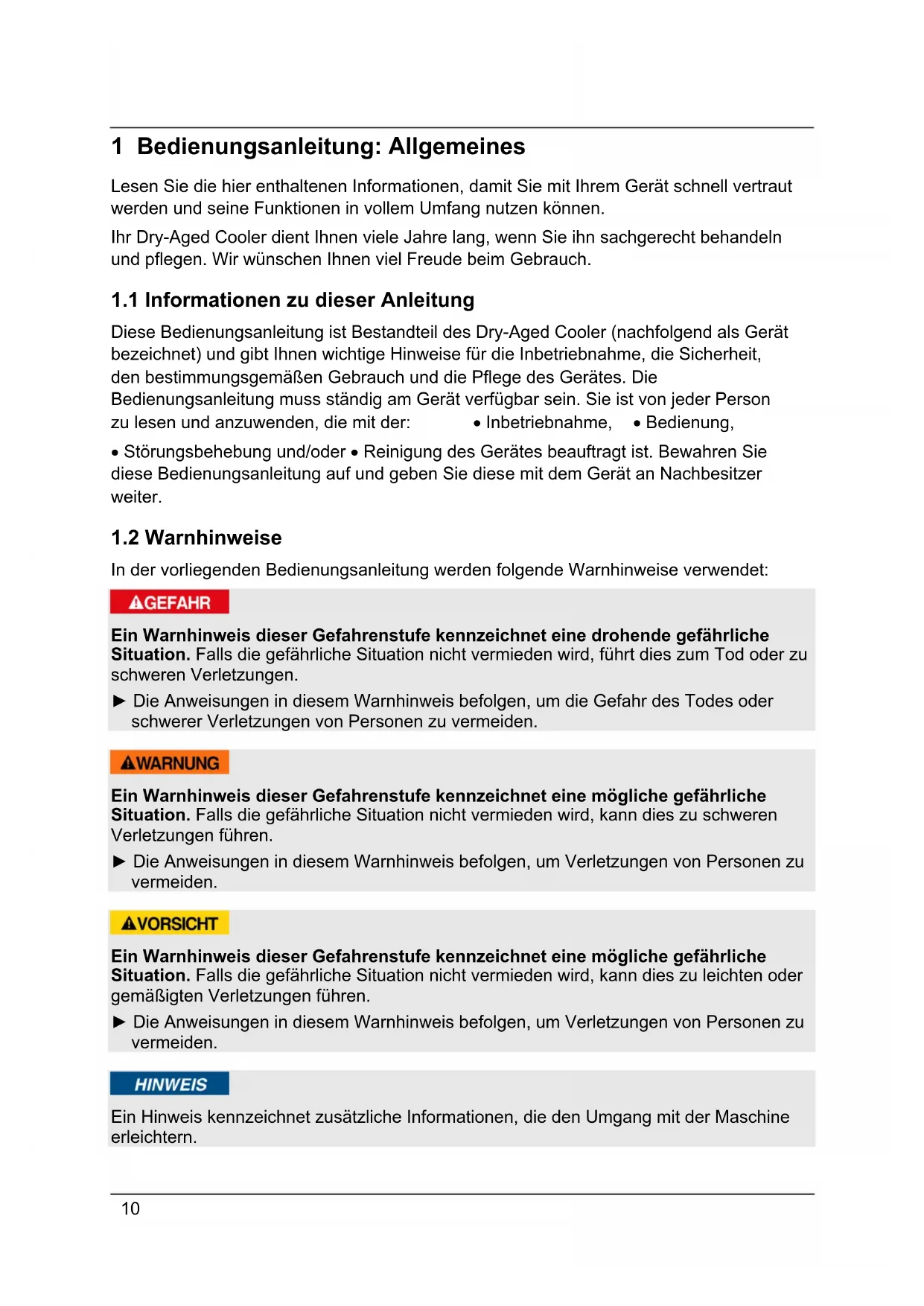 Diese Bedienungsanleitung ist Bestandteil des Dry-Aged Cooler (nachfolgend als Gerät bezeichnet) und gibt Ihnen wichtige Hinweise für die Inbetriebnahme, die Sicherheit, den bestimmungsgemäßen Gebrauch und die Pflege des Gerätes. Die Bedienungsanleitung muss ständig am Gerät verfügbar sein. Sie ist von jeder Person zu lesen und anzuwenden, die mit der: Inbetriebnahme, Bedienung, Störungsbehebung und/oder Reinigung des Gerätes beauftragt ist. Bewahren Sie diese Bedienungsanleitung auf und geben Sie diese mit dem Gerät an Nachbesitzer weiter.