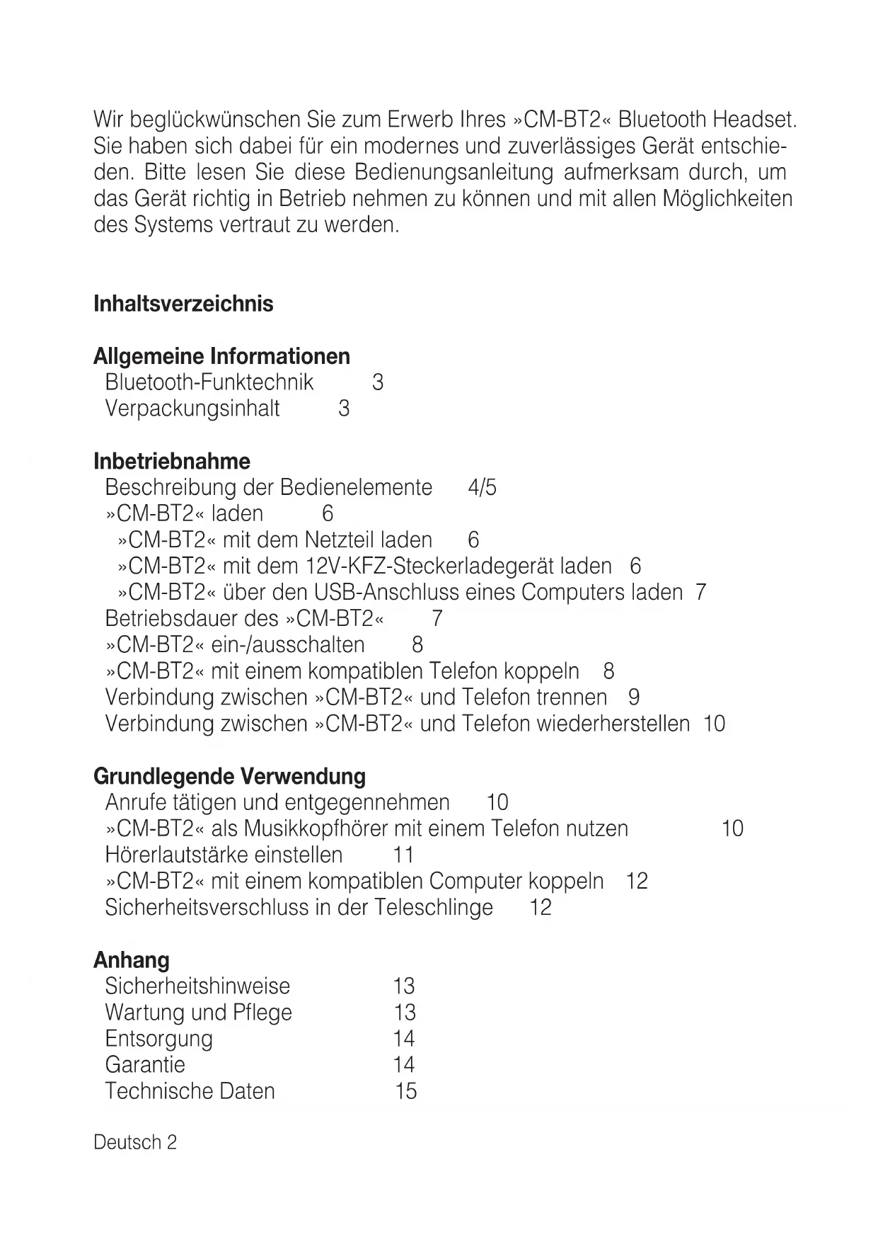 Wir beträckwūnschen Sie zum Erwerb Ihr's »CM-BT2« Bluetooth Headset. Sie haben sich damit für ein modernes und zuverlässiges Gerät entschieden.itte lessen Sie diese Bedienungsanleitung aufmerksam durch, um das Gerät richtig in Betrieb erhmen zu konnen und mit allen Mänglichkeiten des Systems vertraut zu werden.