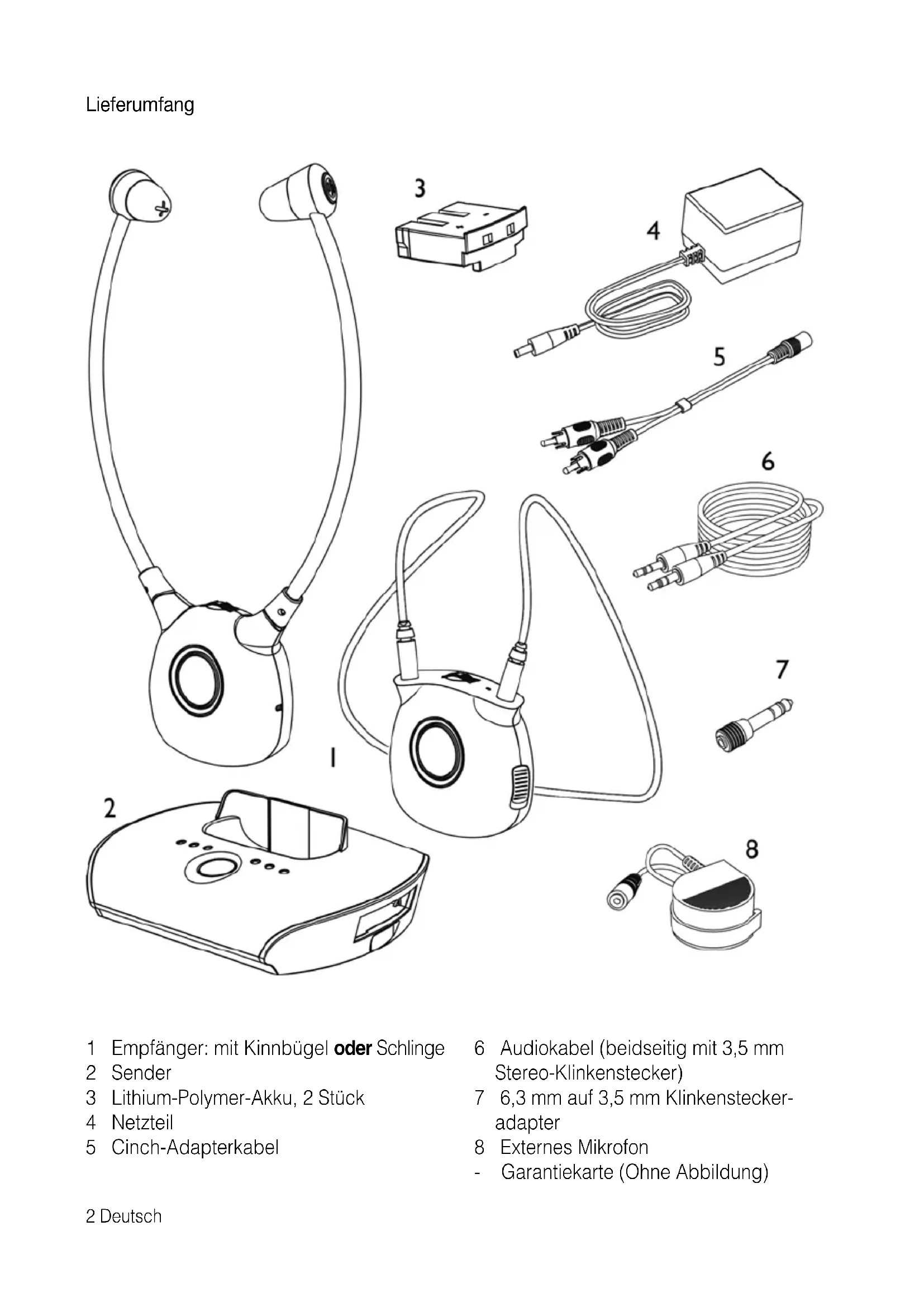 - Cinch-Adapterkabel, Audiokabel, 6.3 mm auf 3.5 mm Klinkensteckeradapter und das externe Mikrofon dienen zur Verbindung für verschiedene Anschlussarten an ihre gewünschte Tonquelle (zum Beispiel DVD- oder CD-Wiedergabegerät, Fernseher, Stereoanlage oder MP3-Player).