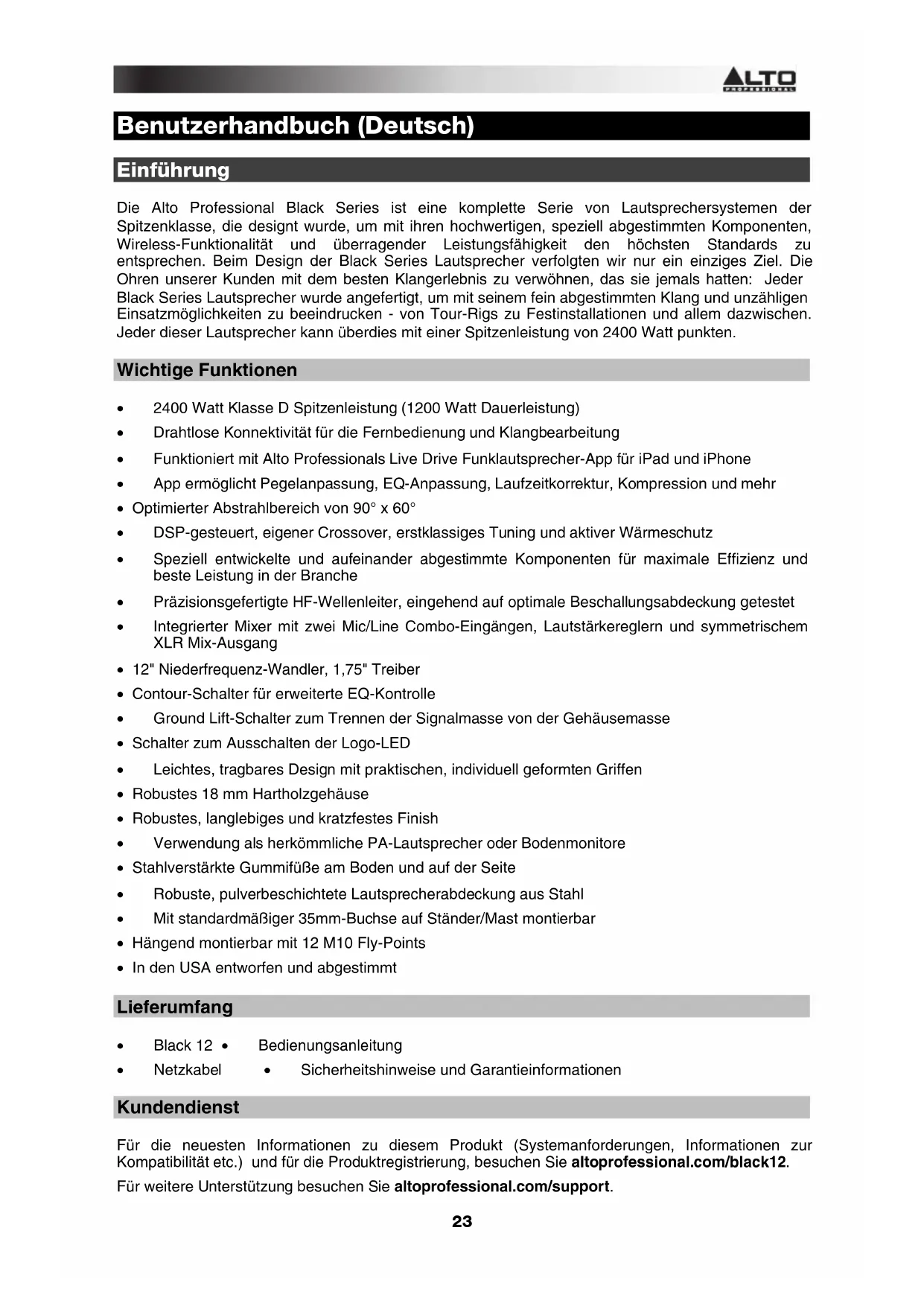 - Netzkabel • Sicherheitshinweise und Garantieinformationen Kundendienst Für die neuesten Informationen zu diesem Produkt (Systemanforderungen, Informationen zur Kompatibilität etc.) und für die Produktregistrierung, besuchen Sie altoprofessional.com/black12. Für weitere Unterstützung besuchen Sie altoprofessional.com/support.24