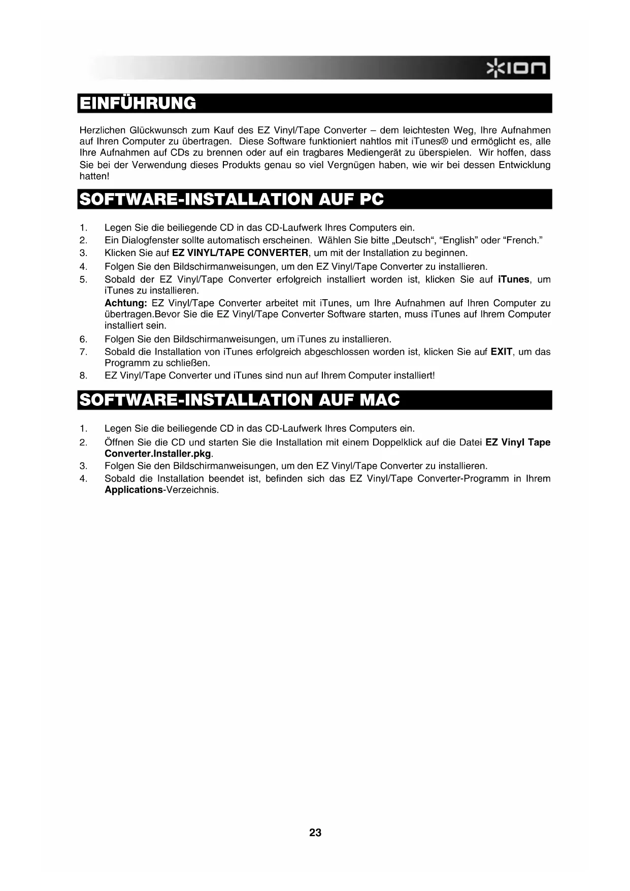 EINFÜHRUNG Herzlichen Glückwunsch zum Kauf des EZ Vinyl/Tape Converter – dem leichtesten Weg, Ihre Aufnahmen auf Ihren Computer zu übertragen. Diese Software funktioniert nahtlos mit iTunes® und ermöglicht es, alle Ihre Aufnahmen auf CDs zu brennen oder auf ein tragbares Mediengerät zu überspielen. Wir hoffen, dass Sie bei der Verwendung dieses Produkts genau so viel Vergnügen haben, wie wir bei dessen Entwicklung hatten!