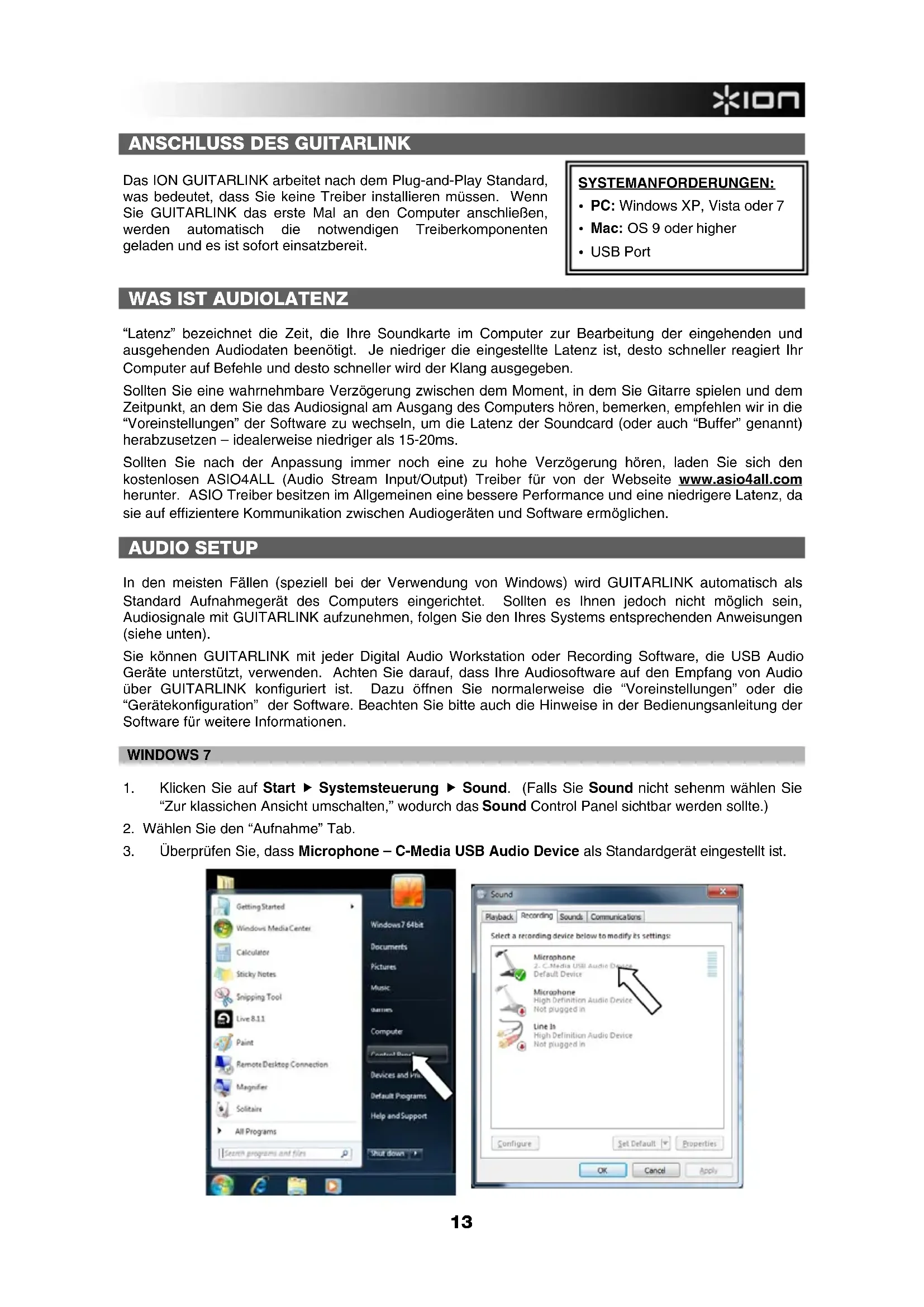 “Latenz” bezeichnet die Zeit, die Ihre Soundkarte im Computer zur Bearbeitung der eingehenden und ausgehenden Audiodaten beenötigt. Je niedriger die eingestellte Latenz ist, desto schneller reagiert Ihr Computer auf Befehle und desto schneller wird der Klang ausgegeben. Sollten Sie eine wahrnehmbare Verzögerung zwischen dem Moment, in dem Sie Gitarre spielen und dem Zeitpunkt, an dem Sie das Audiosignal am Ausgang des Computers hören, bemerken, empfehlen wir in die “Voreinstellungen” der Software zu wechseln, um die Latenz der Soundcard (oder auch “Buffer” genannt) herabzusetzen – idealerweise niedriger als 15-20ms. Sollten Sie nach der Anpassung immer noch eine zu hohe Verzögerung hören, laden Sie sich den kostenlosen ASIO4ALL (Audio Stream Input/Output) Treiber für von der Webseite www.asio4all.com herunter. ASIO Treiber besitzen im Allgemeinen eine bessere Performance und eine niedrigere Latenz, da sie auf effizientere Kommunikation zwischen Audiogeräten und Software ermöglichen. AUDIO SETUP In den meisten Fällen (speziell bei der Verwendung von Windows) wird GUITARLINK automatisch als Standard Aufnahmegerät des Computers eingerichtet. Sollten es Ihnen jedoch nicht möglich sein, Audiosignale mit GUITARLINK aufzunehmen, folgen Sie den Ihres Systems entsprechenden Anweisungen (siehe unten). Sie können GUITARLINK mit jeder Digital Audio Workstation oder Recording Software, die USB Audio Geräte unterstützt, verwenden. Achten Sie darauf, dass Ihre Audiosoftware auf den Empfang von Audio über GUITARLINK konfiguriert ist. Dazu öffnen Sie normalerweise die “Voreinstellungen” oder die “Gerätekonfiguration” der Software. Beachten Sie bitte auch die Hinweise in der Bedienungsanleitung der Software für weitere Informationen. WINDOWS 7