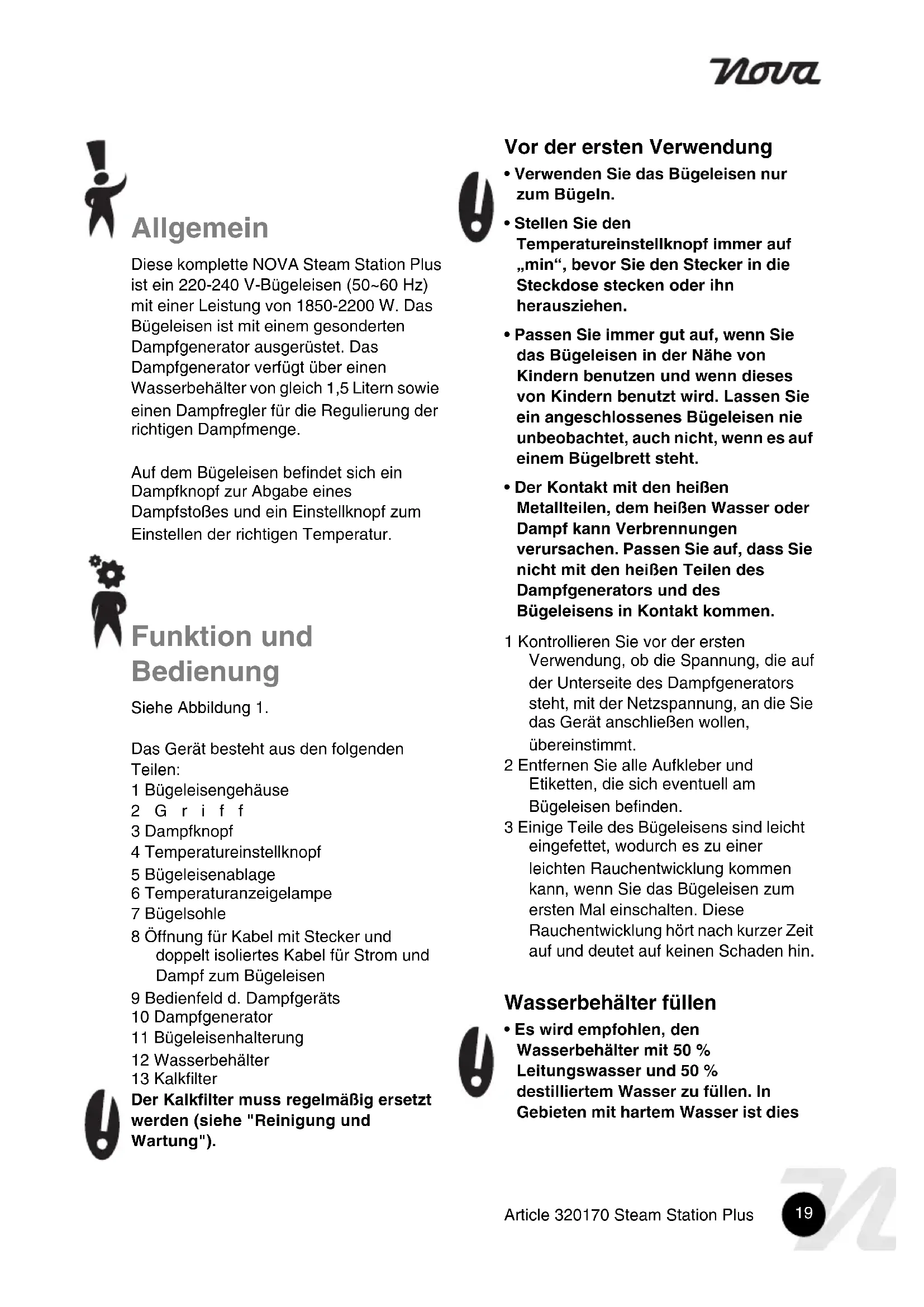 - 2002/96/EG19 Article 320170 Steam Station Plus Allgemein Diese komplette NOVA Steam Station Plus ist ein 220-240 V-Bügeleisen (50~60 Hz) mit einer Leistung von 1850-2200 W. Das Bügeleisen ist mit einem gesonderten Dampfgenerator ausgerüstet. Das Dampfgenerator verfügt über einen Wasserbehälter von gleich 1,5 Litern sowie einen Dampfregler für die Regulierung der richtigen Dampfmenge. Auf dem Bügeleisen befindet sich ein Dampfknopf zur Abgabe eines Dampfstoßes und ein Einstellknopf zum Einstellen der richtigen Temperatur. Funktion und Bedienung Siehe Abbildung 1. Das Gerät besteht aus den folgenden Teilen: 1 Bügeleisengehäuse 2Griff 3 Dampfknopf 4 Temperatureinstellknopf 5 Bügeleisenablage 6 Temperaturanzeigelampe 7 Bügelsohle 8 Öffnung für Kabel mit Stecker und doppelt isoliertes Kabel für Strom und Dampf zum Bügeleisen 9 Bedienfeld d. Dampfgeräts 10 Dampfgenerator 11 Bügeleisenhalterung 12 Wasserbehälter 13 Kalkfilter Der Kalkfilter muss regelmäßig ersetzt werden (siehe "Reinigung und Wartung"). Vor der ersten Verwendung