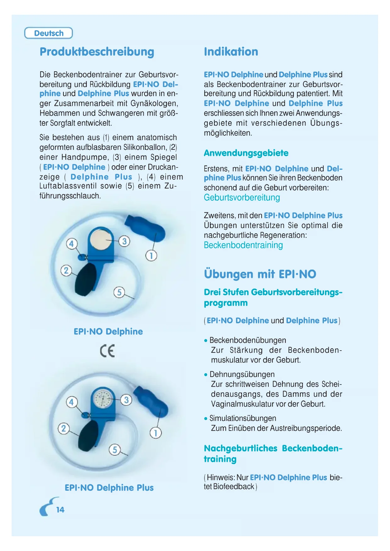 EPI-NO Delphine und Delphine Plus sind als Beckenbodentrainer zur Geburtsvorbereitung und Rückbildung patentiert. Mit EPI-NO Delphine und Delphine Plus erschliessen sich ihren zwei Anwendungsgebiete mit verschiedenen Übungsmöglichkeiten.
