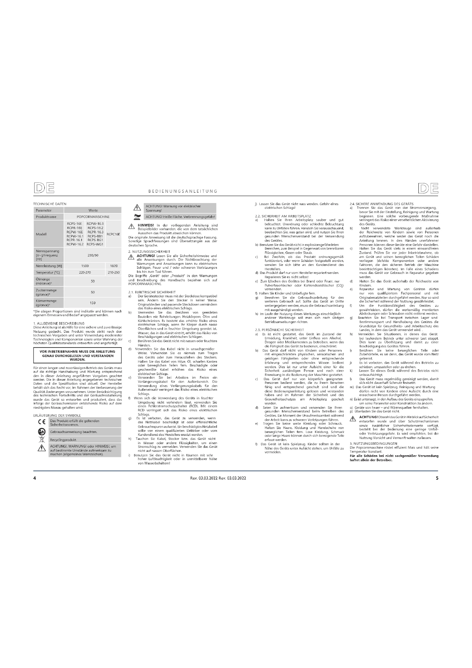 Die Popcornmaschine röstet ezient Mais und hält seine Temperatur konstant. Für alle Schäden bei nicht sachgemäßer Verwendung haftet allein der Betreiber. ACHTUNG! Obwohl das Gerät in Hinblick auf Sicherheit entworfen wurde und über Schutzmechanismen sowie zusätzlicher Sicherheitselemente verfügt, besteht bei der Bedienung eine geringe Unfall- oder Verletzungsgefahr. Es wird empfohlen, bei der Nutzung Vorsicht und Vernunft walten zu lassen.