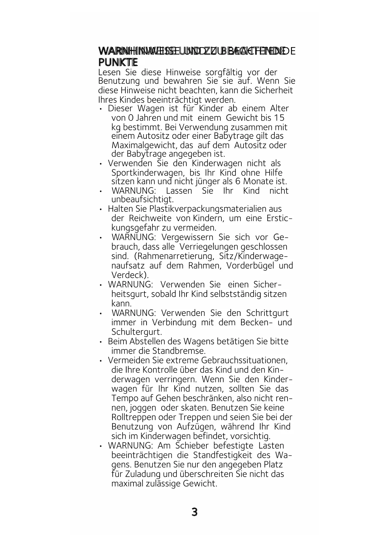 - Die Metallteile müssen regelmäßig gereinigt werden. Regelmäßige Behandlung mit einem Silikonspray schützt vor Korrosion und Ablagerungen. ANMERKUNG: Die Gefahr auf Korrosion ist insbesondere beim Gebrauch am Strand gegeben. Das Fahren durch Meerwasser ist nicht zu empfehlen. Reinigen Sie die Räder nach einem Ausflug an den Strand gründlich. Dasselbe gilt bei winterlichen Bedingungen, wo das Streuen von Salz auf den Straßen zum selben Ergebnis führen kann.11 warnings and points of attention Read these instructions carefully before use and keep them for future reference. Your child’s safety may be affected if you do not follow these instructions.