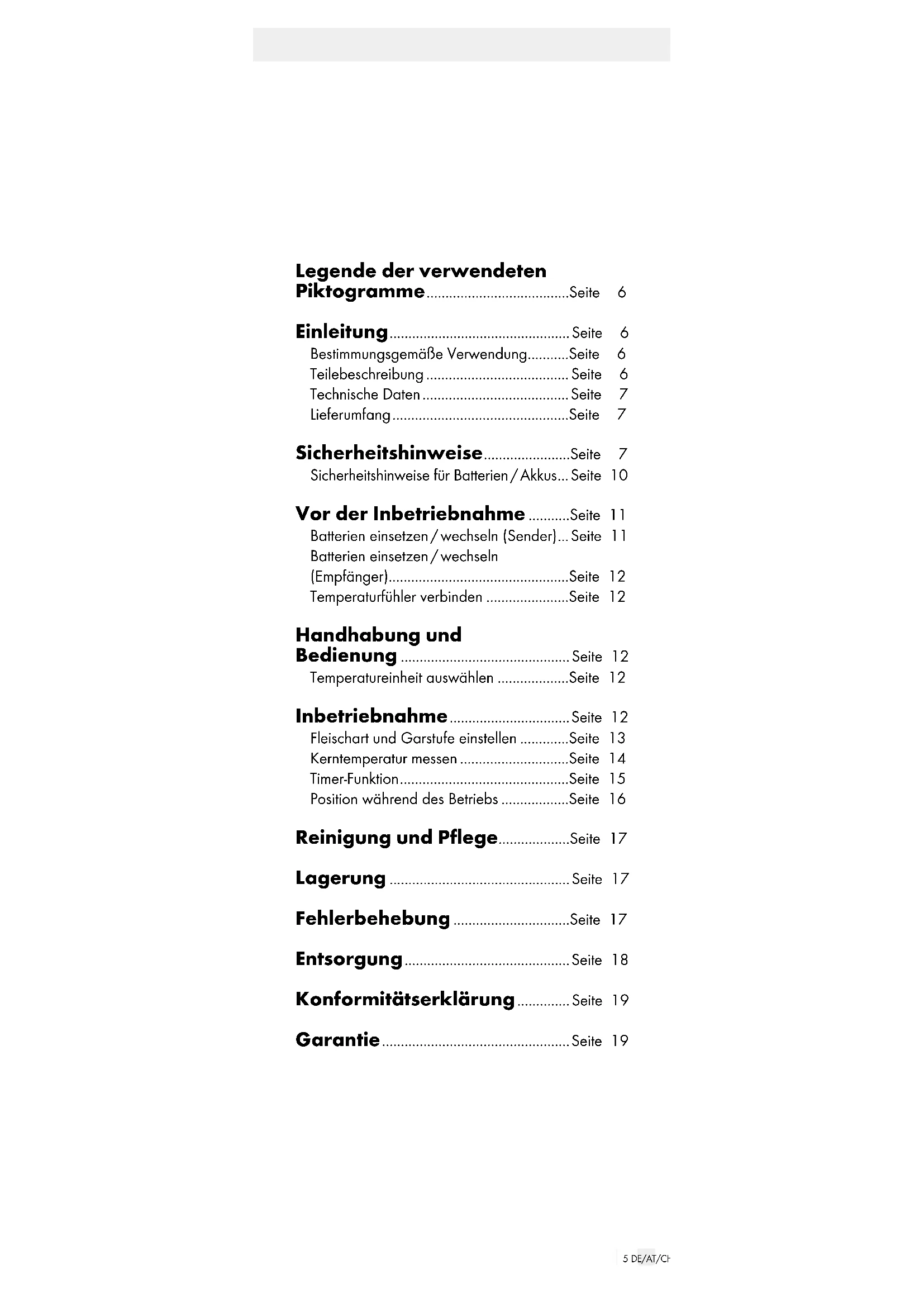 215 DE/AT/CH Legende der verwendeten Piktogramme ......................................Seite 6 Einleitung ................................................Seite 6 Bestimmungsgemäße Verwendung ...........Seite 6 Teilebeschreibung ...................................... Seite 6 Technische Daten ....................................... Seite 7 Lieferumfang ...............................................Seite 7 Sicherheitshinweise .......................Seite 7 Sicherheitshinweise für Batterien / Akkus ...Seite 10 Vor der Inbetriebnahme ...........Seite 11 Batterien einsetzen / wechseln (Sender) ...Seite 11 Batterien einsetzen / wechseln (Empfänger) ................................................Seite 12 Temperaturfühler verbinden ......................Seite 12 Handhabung und Bedienung .............................................Seite 12 Temperatureinheit auswählen ...................Seite 12 Inbetriebnahme ................................ Seite 12 Fleischart und Garstufe einstellen .............Seite 13 Kerntemperatur messen .............................Seite 14 Timer-Funktion .............................................Seite 15 Position während des Betriebs ..................Seite 16 Reinigung und Pflege ...................Seite 17 Lagerung ................................................Seite 17 Fehlerbehebung ...............................Seite 17 Entsorgung ............................................ Seite 18 Konformitätserklärung .............. Seite 19 Garantie .................................................. Seite 196 DE/AT/CH Legende der verwendeten Piktogramme Warn- und Sicherheits hinweise beachten! Produkt entspricht den produktspezifisch geltenden europäischen Richtlinien Gleichstrom LEBENSMITTELECHT! Geschmacks- und Geruchseigenschaften werden durch dieses Produkt nicht beeinträchtigt. °C Celsius °F Fahrenheit Funk-Grillthermometer Einleitung Wir beglückwünschen Sie zum Kauf Ihres neuen Produkts. Sie haben sich damit für ein hochwertiges Produkt entschieden. Die Bedienungsanleitung ist Teil dieses Produkts. Sie enthält wichtige Hinweise für Sicherheit, Gebrauch und Entsorgung. Machen Sie sich vor der Benutzung des Produkts mit allen Bedien- und Sicherheitshinweisen vertraut. Benutzen Sie das Produkt nur wie beschrieben und für die angegebenen Einsatzbereiche. Händigen Sie alle Unterlagen bei Weitergabe des Produkts an Dritte mit aus. Bestimmungsgemäße Verwendung Das Produkt ist zum Messen und Überwachen der Kerntemperatur von Speisen bestimmt wie Fisch, Rind, Kalb, Schwein, Lamm, Pute, Huhn und Hamburger. Das Produkt ist nur für den Einsatz in privaten Haushalten vorgesehen. Das Produkt ist nicht für den gewerblichen Einsatz oder für andere Einsatzbereiche bestimmt. Teilebeschreibung Empfänger