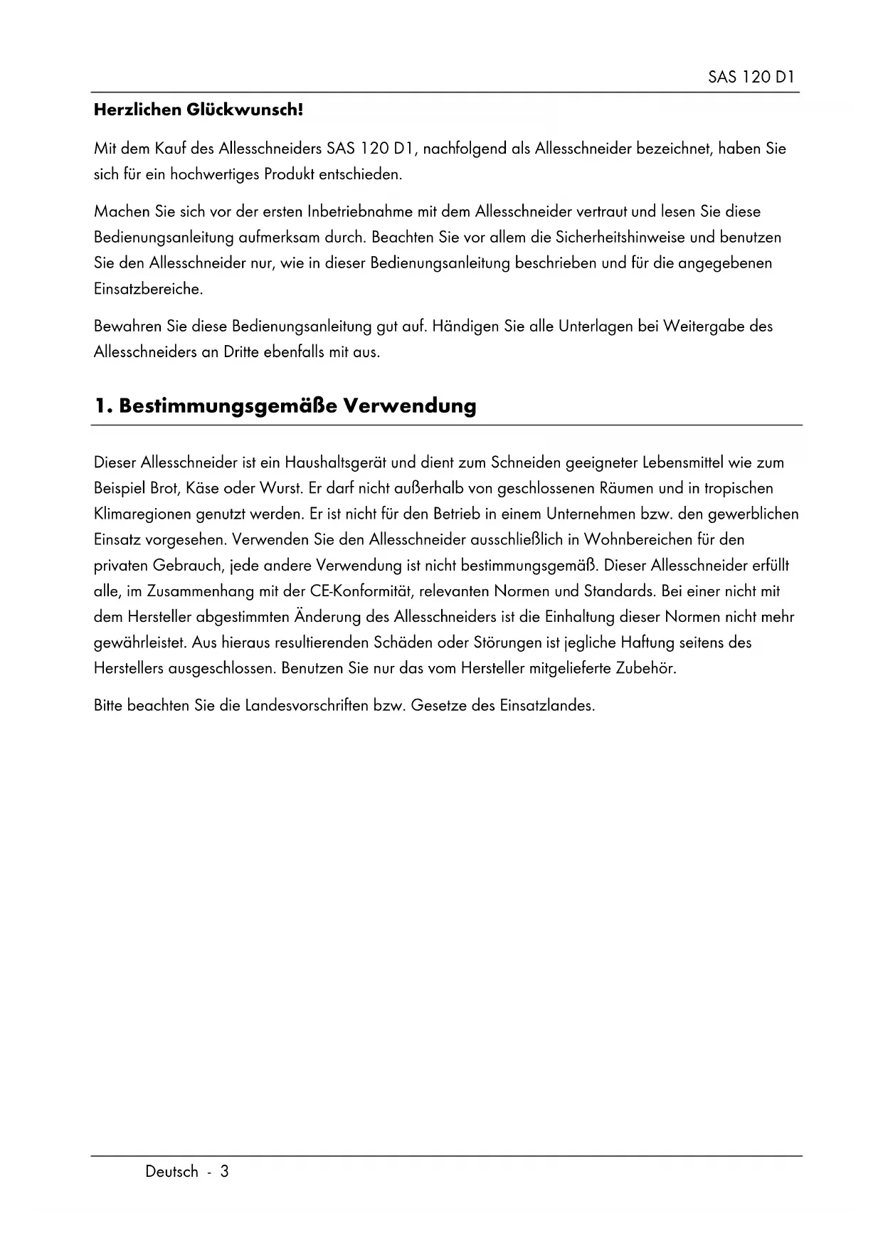 11. Garantiehinweise ....................................................................................... 21SAS 120 D1 Deutsch - 3 Herzlichen Glückwunsch! Mit dem Kauf des Allesschneiders SAS 120 D1, nachfolgend als Allesschneider bezeichnet, haben Sie sich für ein hochwertiges Produkt entschieden. Machen Sie sich vor der ersten Inbetriebnahme mit dem Allesschneider vertraut und lesen Sie diese Bedienungsanleitung aufmerksam durch. Beachten Sie vor allem die Sicherheitshinweise und benutzen Sie den Allesschneider nur, wie in dieser Bedienungsanleitung beschrieben und für die angegebenen Einsatzbereiche. Bewahren Sie diese Bedienungsanleitung gut auf. Händigen Sie alle Unterlagen bei Weitergabe des Allesschneiders an Dritte ebenfalls mit aus.