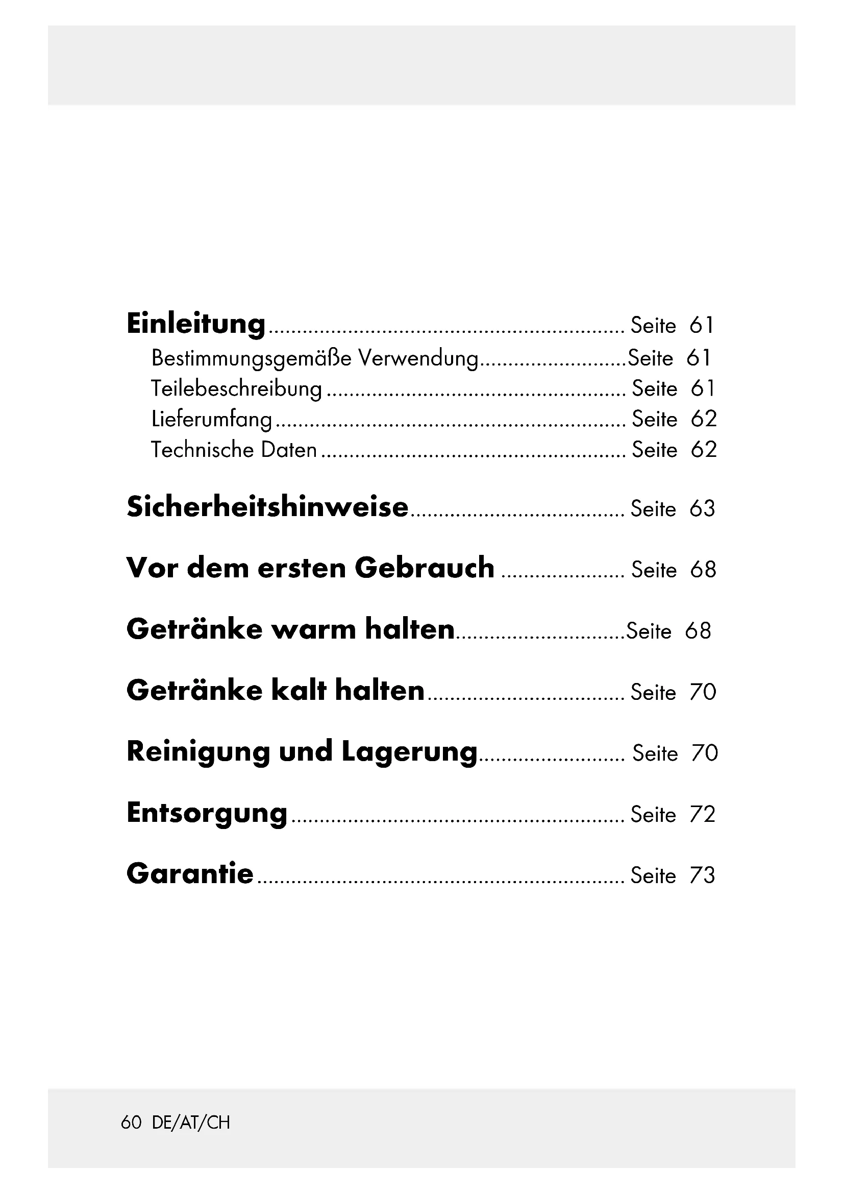 Bestimmungsgemäße Verwendung Das Produkt eignet sich zum Warm- bzw. Kalthalten von Getränken in und außerhalb von Kraftfahrzeugen. Dieses Pro- dukt ist nicht geeignet zum Abkühlen oder Erwärmen von Ge- tränken. Das Produkt ist nur für den privaten Hausgebrauch geeignet und nicht für den gewerblichen Einsatz oder für an- dere Einsatzbereiche bestimmt.
