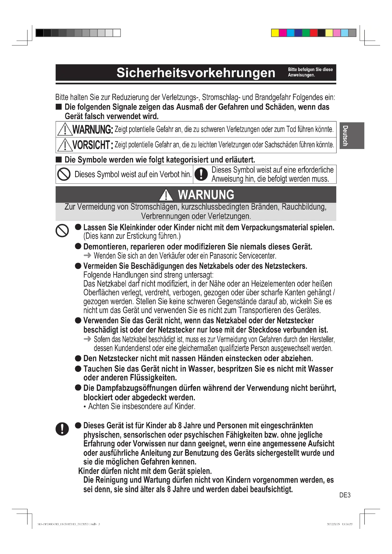 Dieses Gerät ist für Kinder ab 8 Jahre und Personen mit eingeschränkten physischen, sensorischen oder psychischen Fähigkeiten bzw. ohne jegliche Erfahrung oder Vorwissen nur dann geeignet, wenn eine angemessene Aufsicht oder ausführliche Anleitung zur Benutzung des Geräts sichergestellt wurde und sie die möglichen Gefahren kennen. Kinder dürfen nicht mit dem Gerät spielen. Die Reinigung und Wartung dürfen nicht von Kindern vorgenommen werden, es sei denn, sie sind älter als 8 Jahre und werden dabei beaufsichtigt. Sicherheitsvorkehrungen Bitte befolgen Sie diese Anweisungen. Deutsch SD-ZP2000 OI3_DZ50B2113_20220524.indb 3SD-ZP2000 OI3_DZ50B2113_20220524.indb 3 2022/5/25 13:26:232022/5/25 13:26:23DE4 WARNUNG Zur Vermeidung von Stromschlägen, kurzschlussbedingten Bränden, Rauchbildung, Verbrennungen oder Verletzungen.
