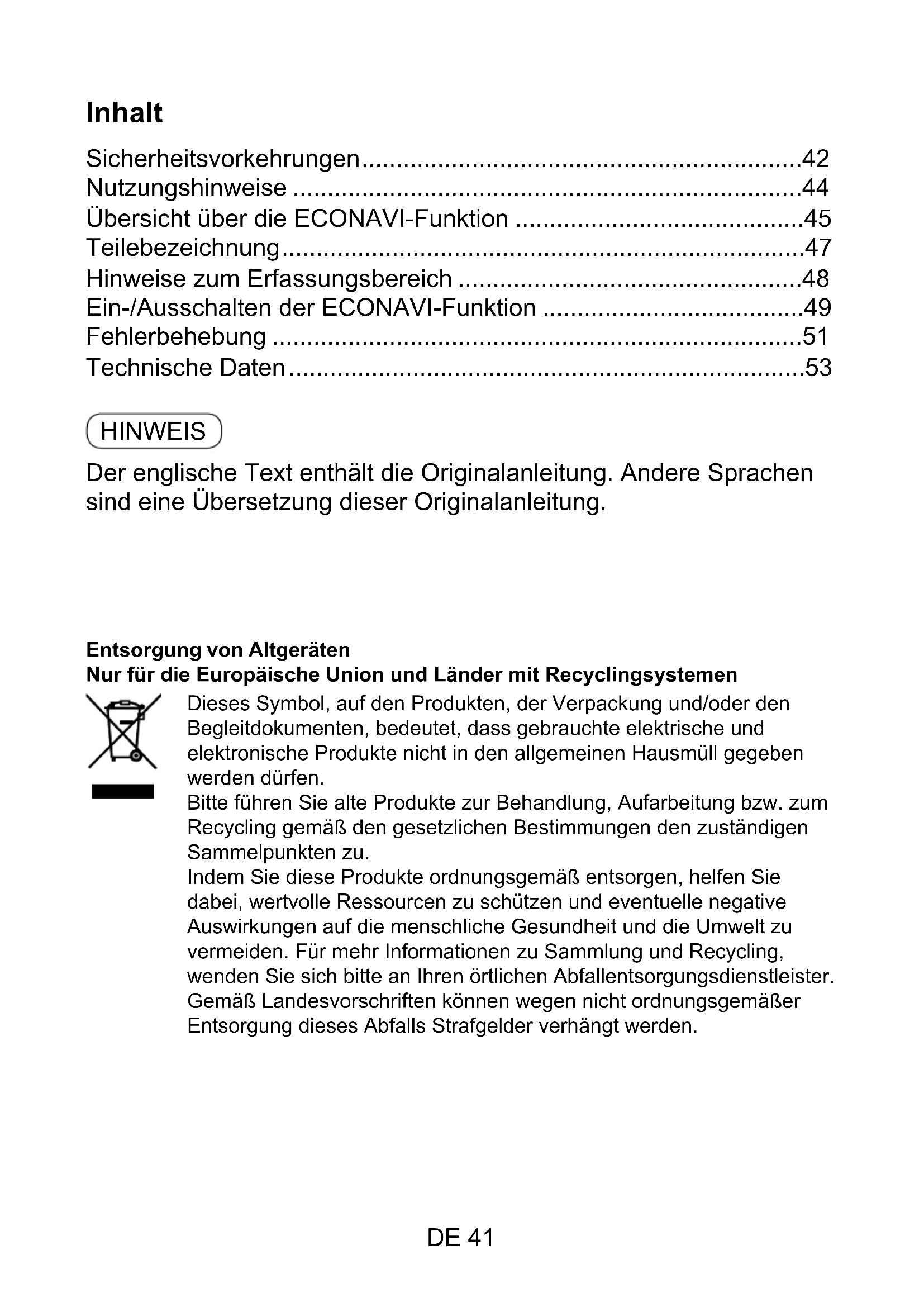 - Solo para uso interior. Fuente de alimentación 16 V CC (suministrada desde la unidad interior) Conexiones 1 sensor por grupo interior ACXF55-00551.indb 40 2021/10/07 9:52:34DE 41 Inhalt Sicherheitsvorkehrungen ................................................................42 Nutzungshinweise ..........................................................................44 Übersicht über die ECONAVI-Funktion ..........................................45 Teilebezeichnung ............................................................................47 Hinweise zum Erfassungsbereich ..................................................48 Ein-/Ausschalten der ECONAVI-Funktion ......................................49 Fehlerbehebung .............................................................................51 Technische Daten ...........................................................................53 HINWEIS Der englische Text enthält die Originalanleitung. Andere Sprachen sind eine Übersetzung dieser Originalanleitung. Entsorgung von Altgeräten Nur für die Europäische Union und Länder mit Recyclingsystemen Dieses Symbol, auf den Produkten, der Verpackung und/oder den Begleitdokumenten, bedeutet, dass gebrauchte elektrische und elektronische Produkte nicht in den allgemeinen Hausmüll gegeben werden dürfen. Bitte führen Sie alte Produkte zur Behandlung, Aufarbeitung bzw. zum Recycling gemäß den gesetzlichen Bestimmungen den zuständigen Sammelpunkten zu. Indem Sie diese Produkte ordnungsgemäß entsorgen, helfen Sie dabei, wertvolle Ressourcen zu schützen und eventuelle negative Auswirkungen auf die menschliche Gesundheit und die Umwelt zu vermeiden. Für mehr Informationen zu Sammlung und Recycling, wenden Sie sich bitte an Ihren örtlichen Abfallentsorgungsdienstleister. Gemäß Landesvorschriften können wegen nicht ordnungsgemäßer Entsorgung dieses Abfalls Strafgelder verhängt werden. ACXF55-00551.indb 41 2021/10/07 9:52:35DE 42